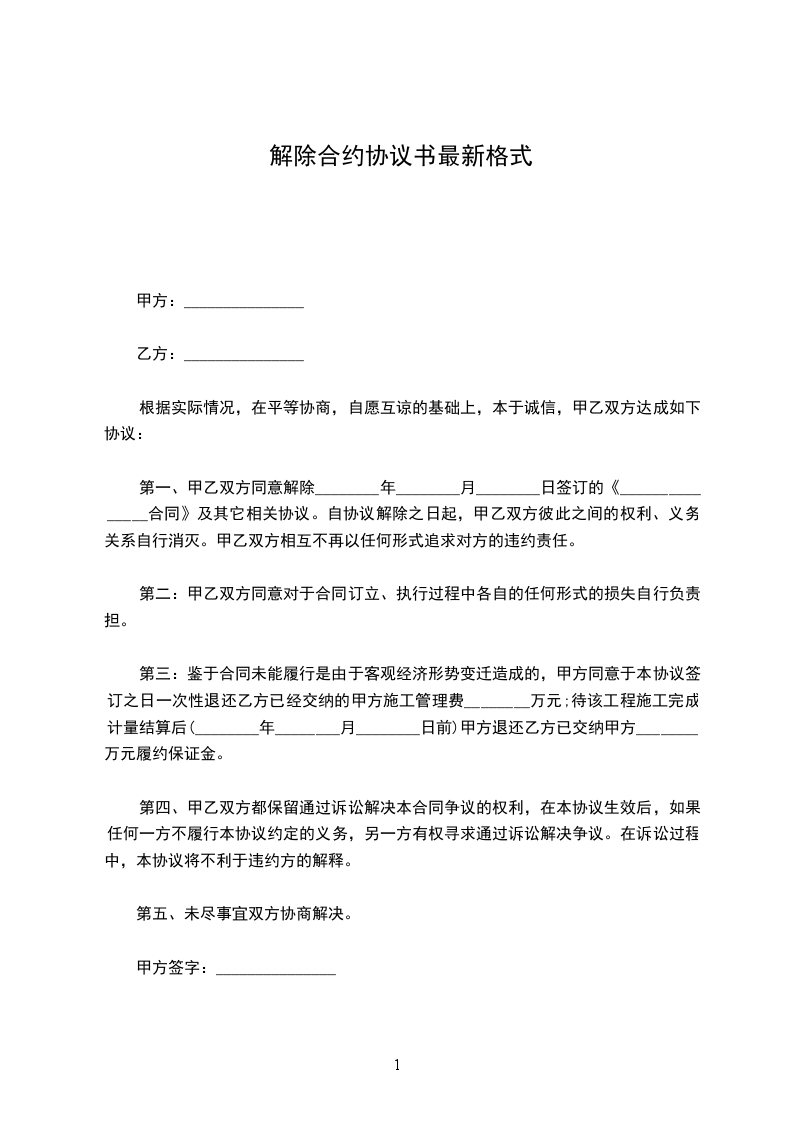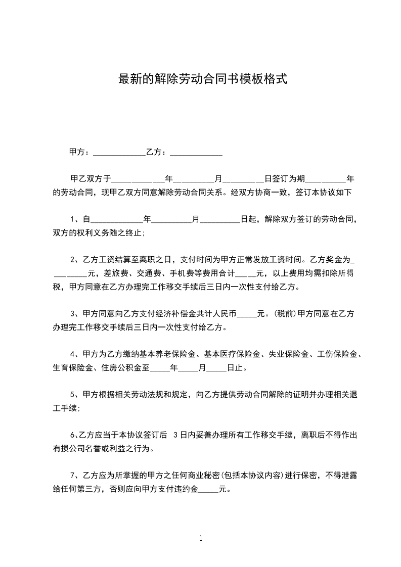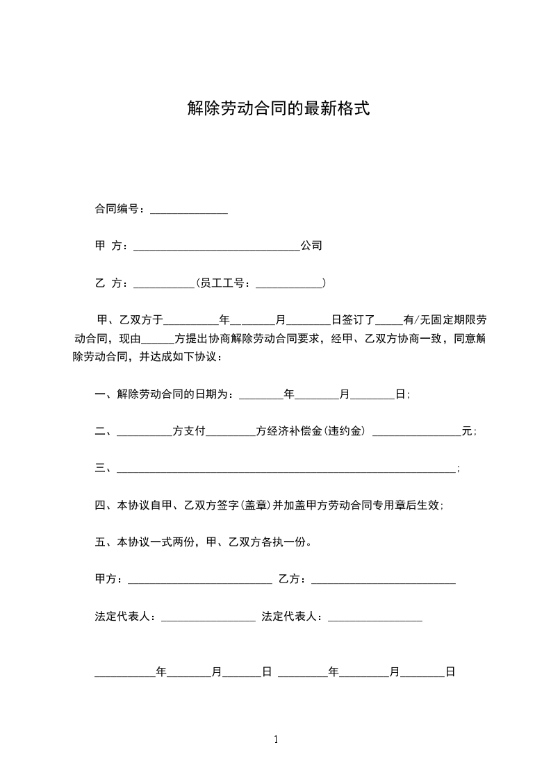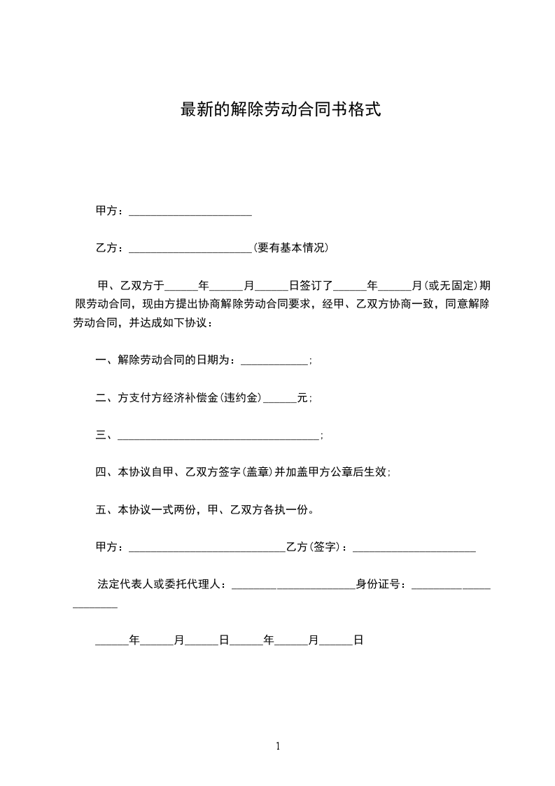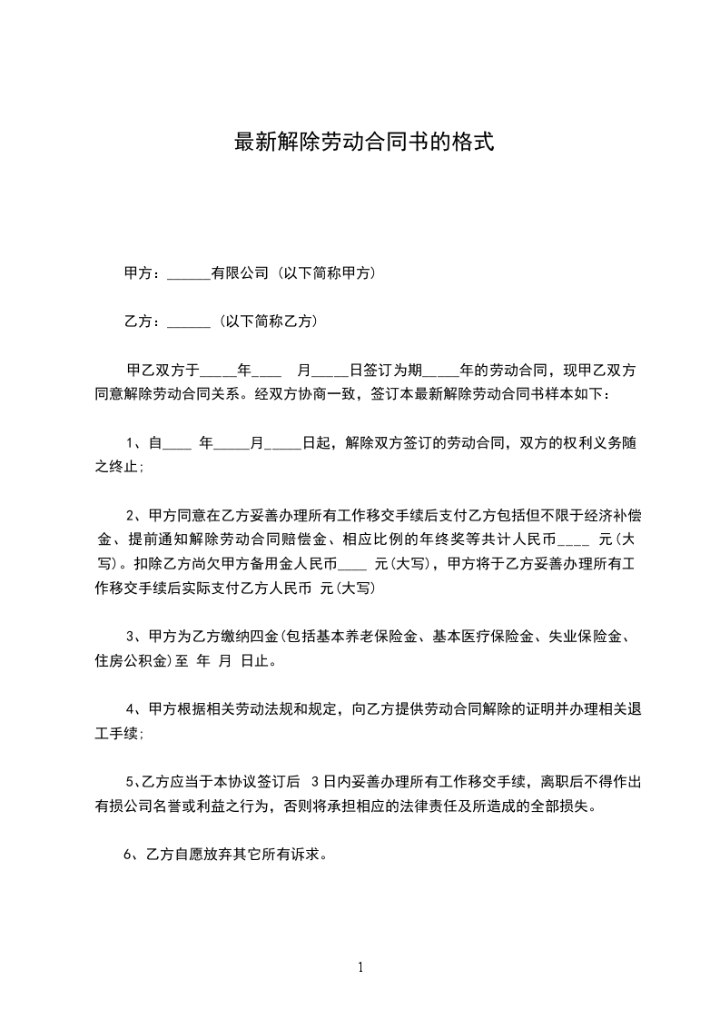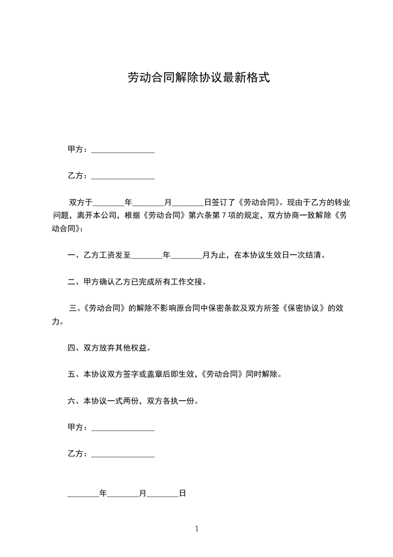 1、自_____________年__________月__________日起,解除双方签订的劳动合同,双方的权利义务随之终止;