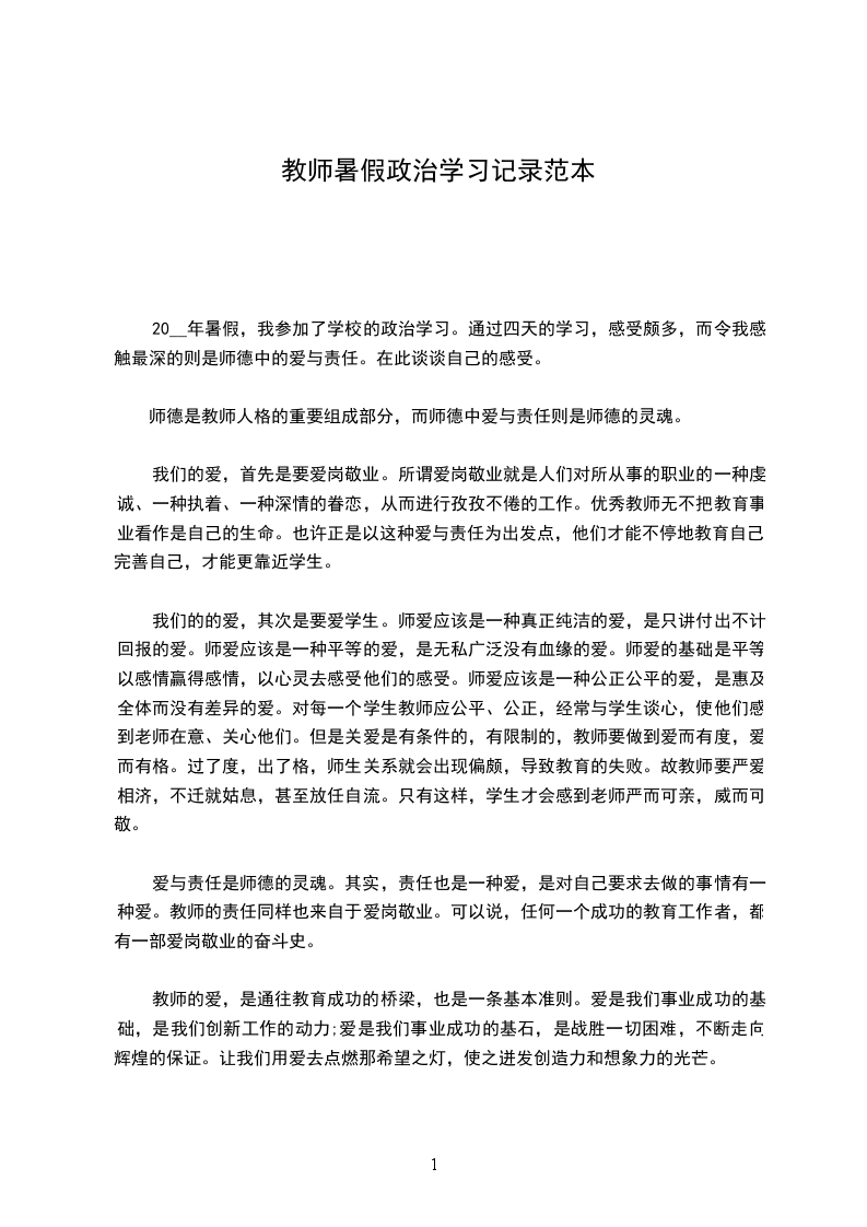 20__年暑假,我参加了学校的政治学习。通过四天的学习,感受颇多,而令我感触最深的则是师德中的爱与责任。在此谈谈自己的感受。
