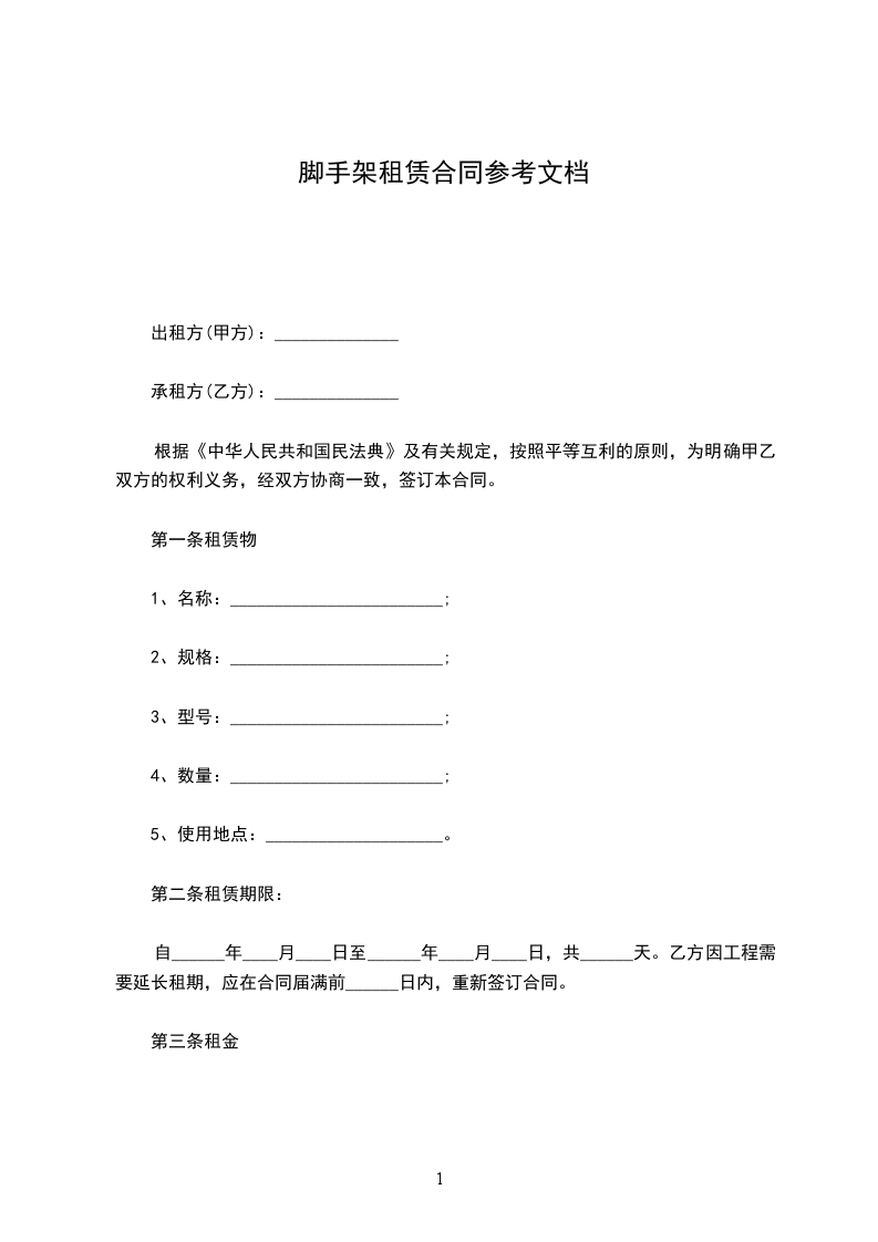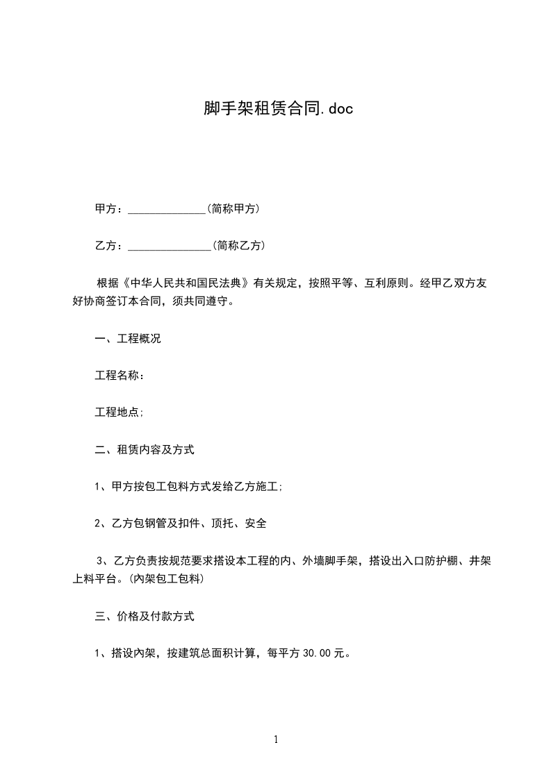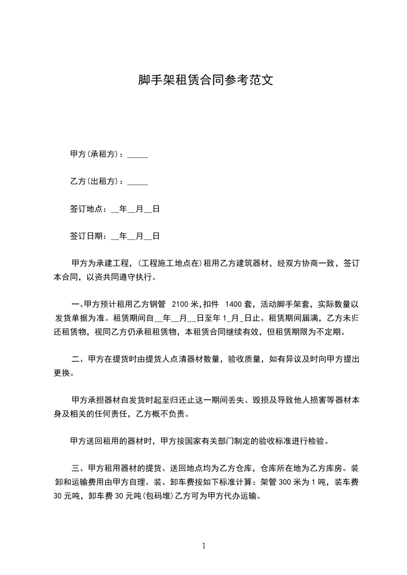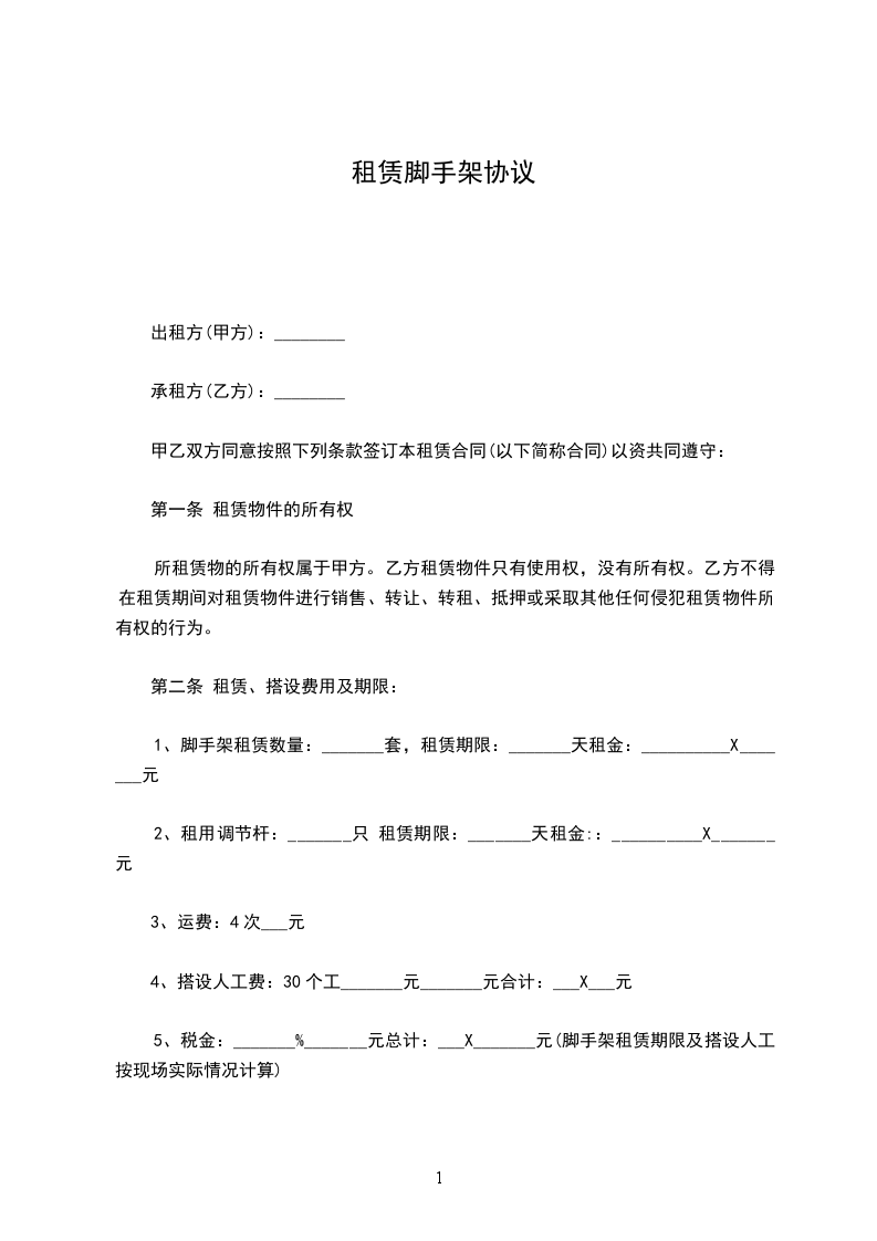 3、脚手架的延期使用费单价计算:合同约定单价租赁时间为30天,超过30天按每天________元/平方米计算。如租赁时间超期7天内不予计费。