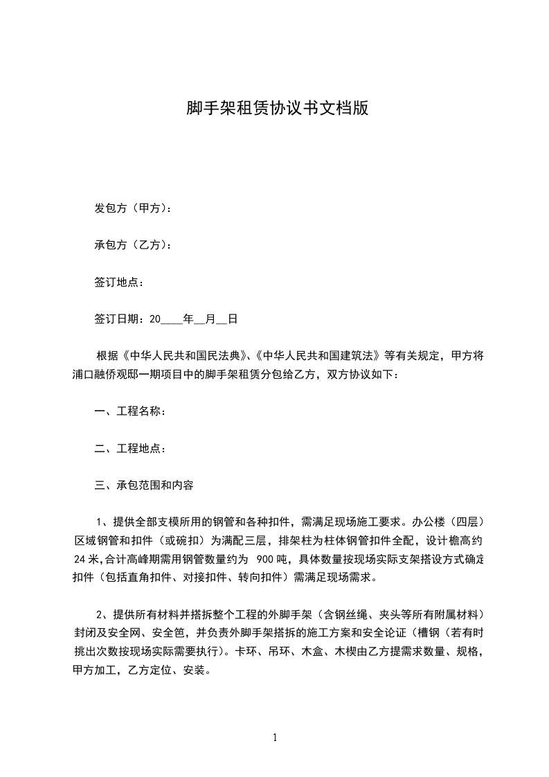1、承包范围: 钢管脚手架的提供、搭设、拆除、铺跳板、加固、装卸车、运输等(包括跳板、围网等)