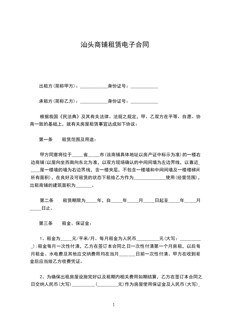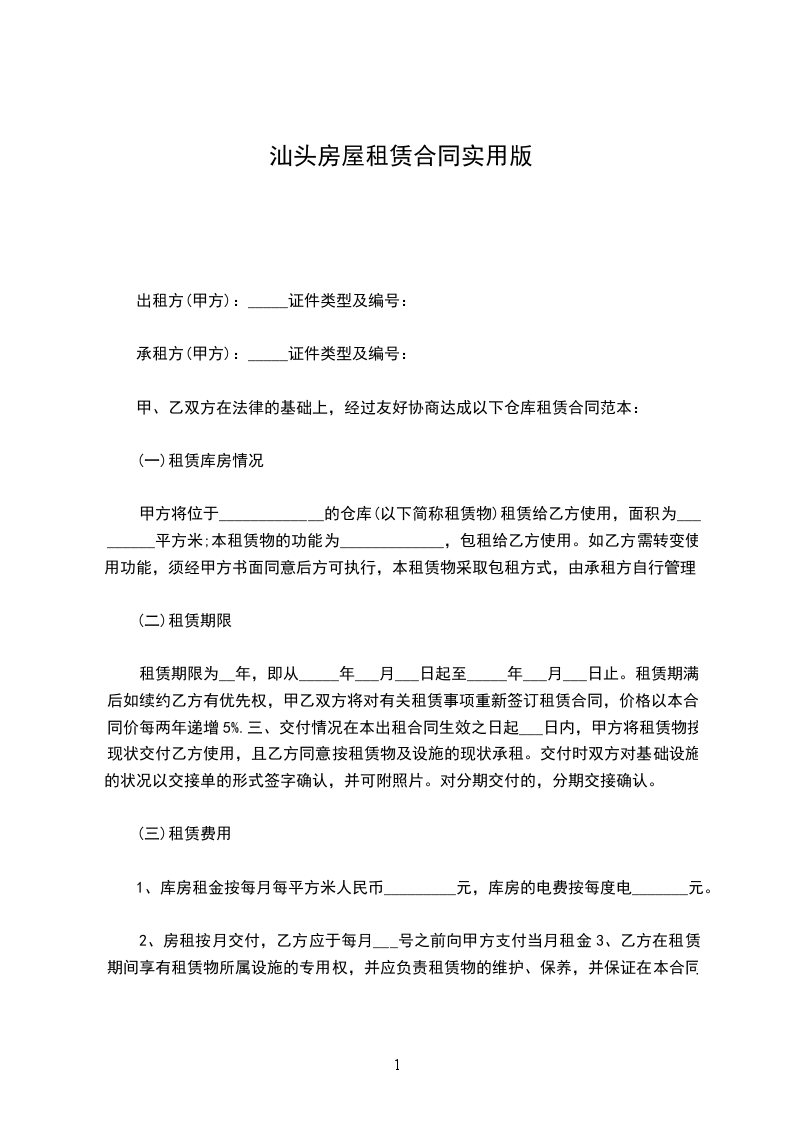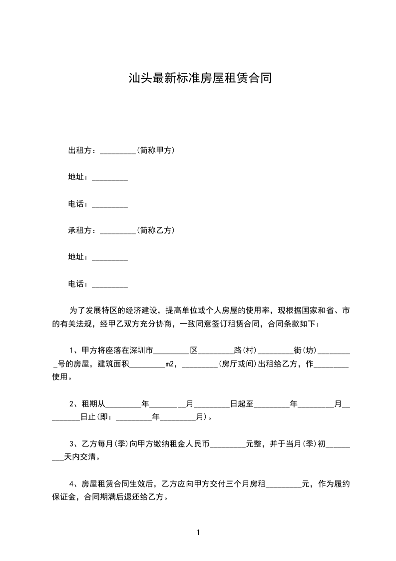 1、甲方将座落在深圳市_________区_________路(村)_________街(坊)_________号的房屋,建筑面积_________m2,_________(房厅或间)出租给乙方,作_________使用。