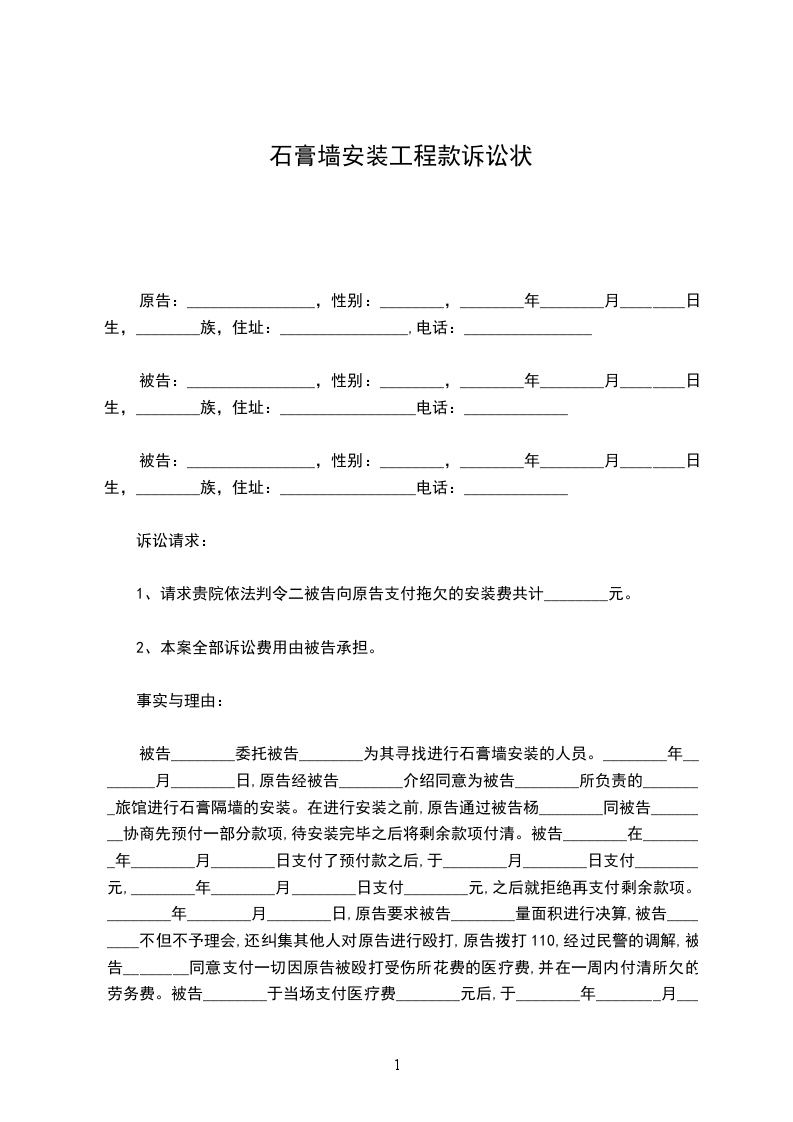 1、请求贵院依法判令二被告向原告支付拖欠的安装费共计________元。