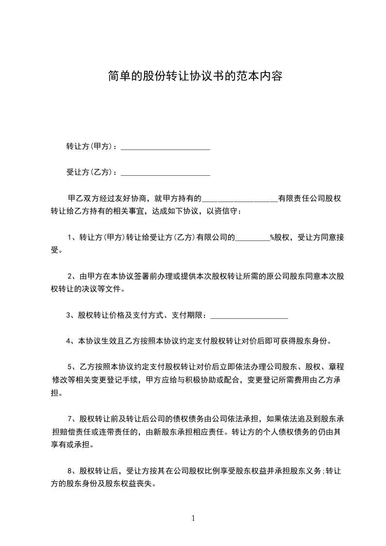 1、转让方(甲方)转让给受让方(乙方)_________________有限公司的________%的股权,受让方同意接受。