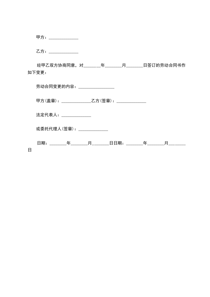 经甲乙双方协商同意,对________年________月________日签订的劳动合同书作如下变更: