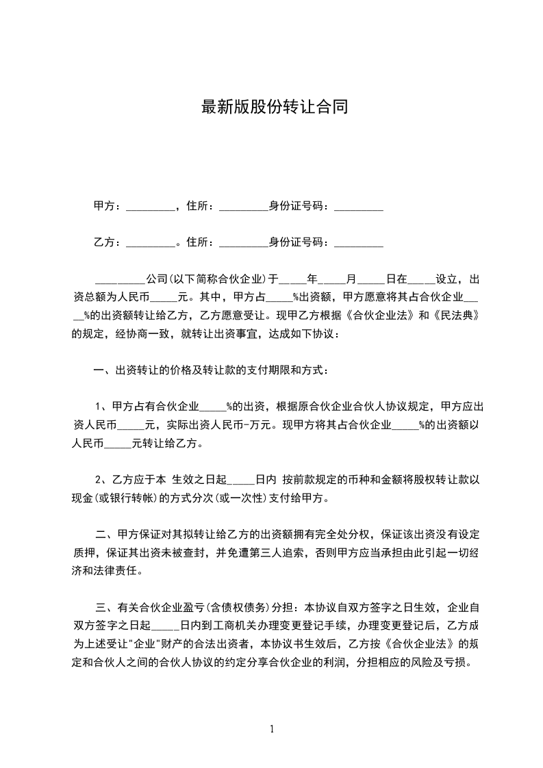 一、合同股份的转让及价格甲方同意将合同股份转让给乙方。乙方承诺以现金受让合同股份。经双方协商,合同股份定价为______元/股,股份收购总价款为_______________元。