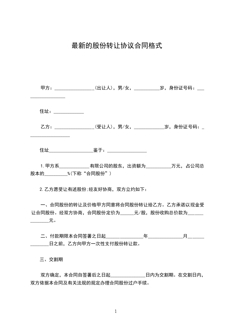 二、付款期限本合同签署之日起________________年_______________月_______________日之前,乙方向甲方一次性支付股份转让款。