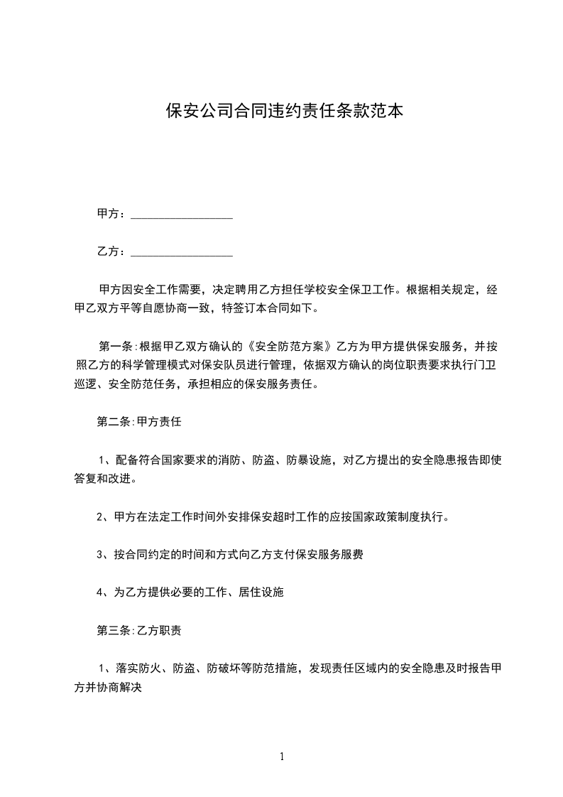 第一条:根据甲乙双方确认的《安全防范方案》乙方为甲方提供保安服务,并按照乙方的科学管理模式对保安队员进行管理,依据双方确认的岗位职责要求执行门卫、巡逻、安全防范任务,承担相应的保安服务责任。