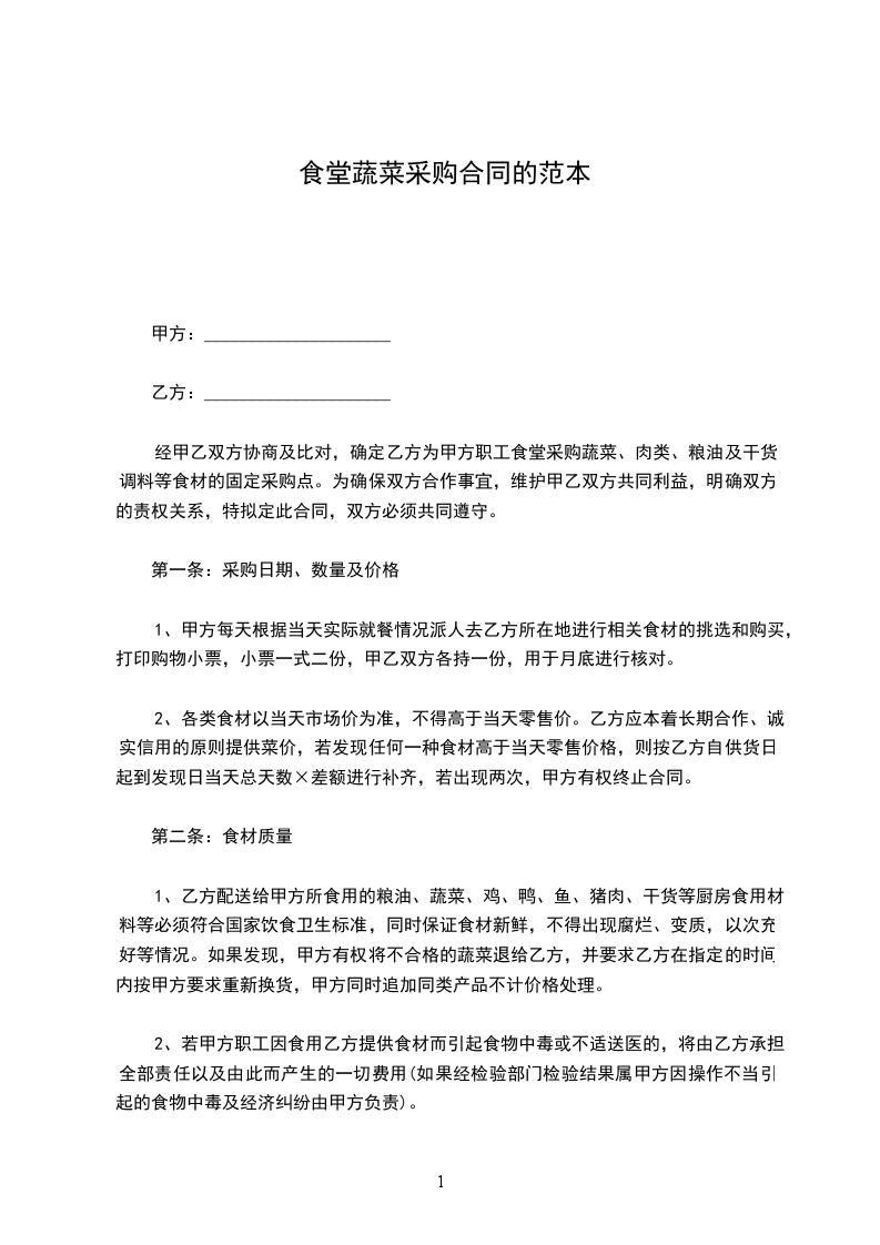 经甲乙双方协商及比对,确定乙方为甲方职工食堂采购蔬菜、肉类、粮油及干货调料等食材的固定采购点。为确保双方合作事宜,维护甲乙双方共同利益,明确双方的责权关系,特拟定此合同,双方必须共同遵守。