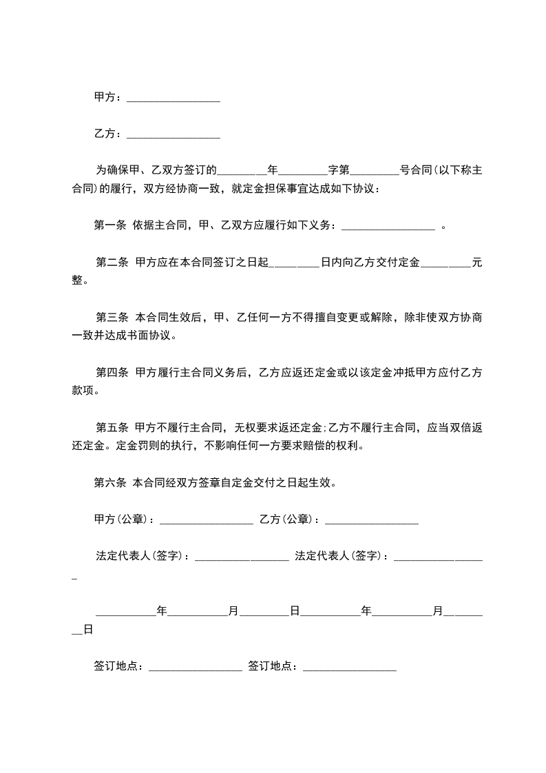 第二条 甲方应在本合同签订之日起_________日内向乙方交付定金_________元整。