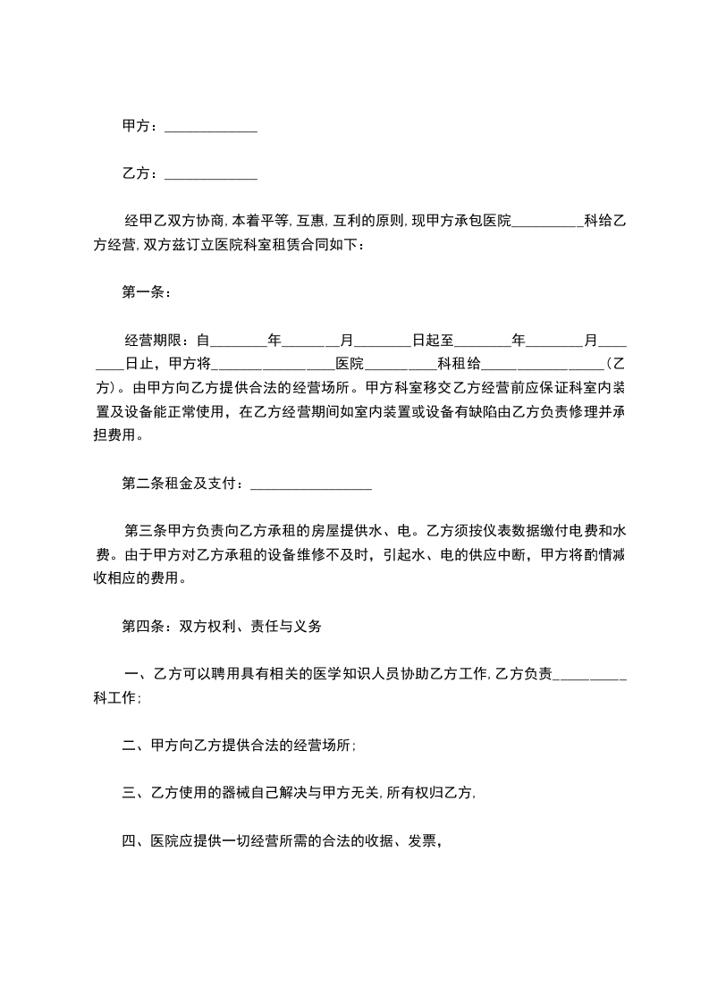 经甲乙双方协商,本着平等,互惠,互利的原则,现甲方承包医院__________科给乙方经营,双方兹订立医院科室租赁合同如下: