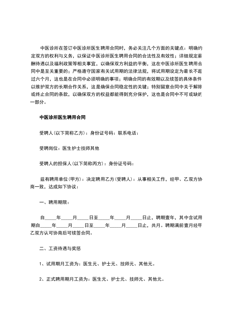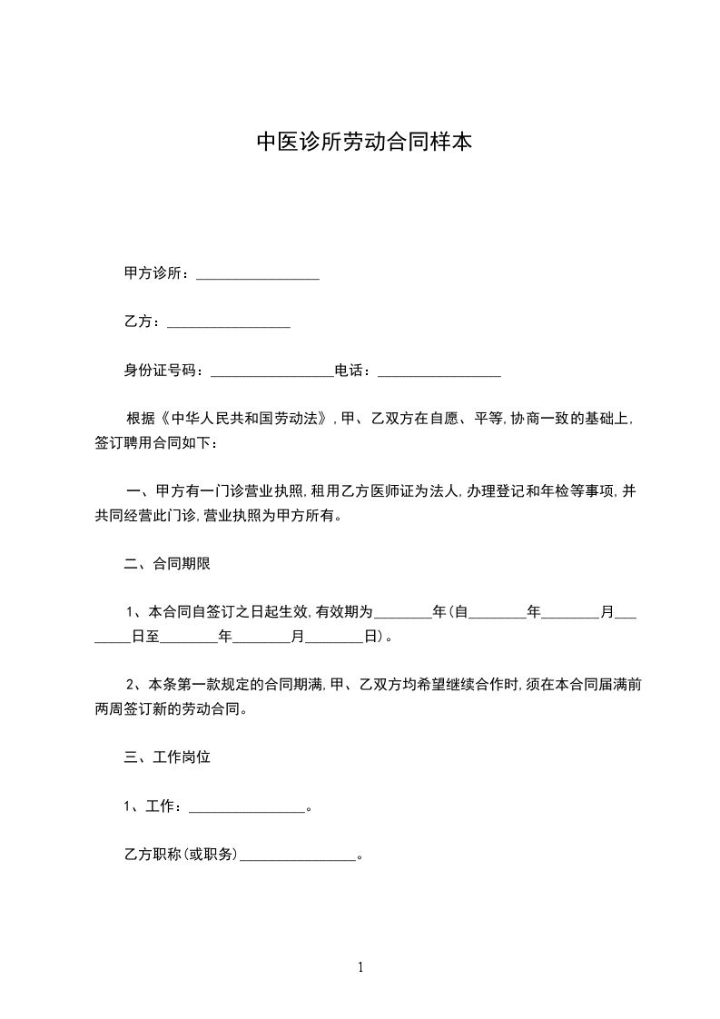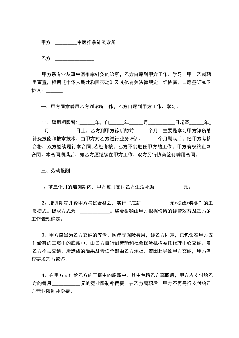 五、工作时间:甲方根据诊所医疗工作特点,规定乙方的工作时间,每天工作时间根据需要具体安排,每天工作8小时,每周休息一天。