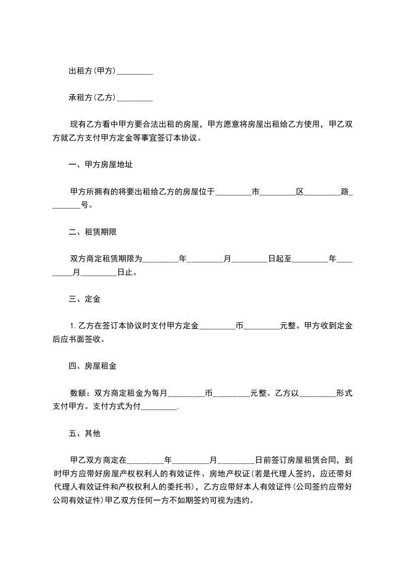 甲乙双方商定在_________年_________月_________日前签订房屋租赁合同,到时甲方应带好房屋产权权利人的有效证件、房地产权证(若是代理人签约,应还带好代理人有效证件和产权权利人的委托书),乙方应带好本人有效证件(公司签约应带好公司有效证件)甲乙双方任何一方不如期签约可视为违约。