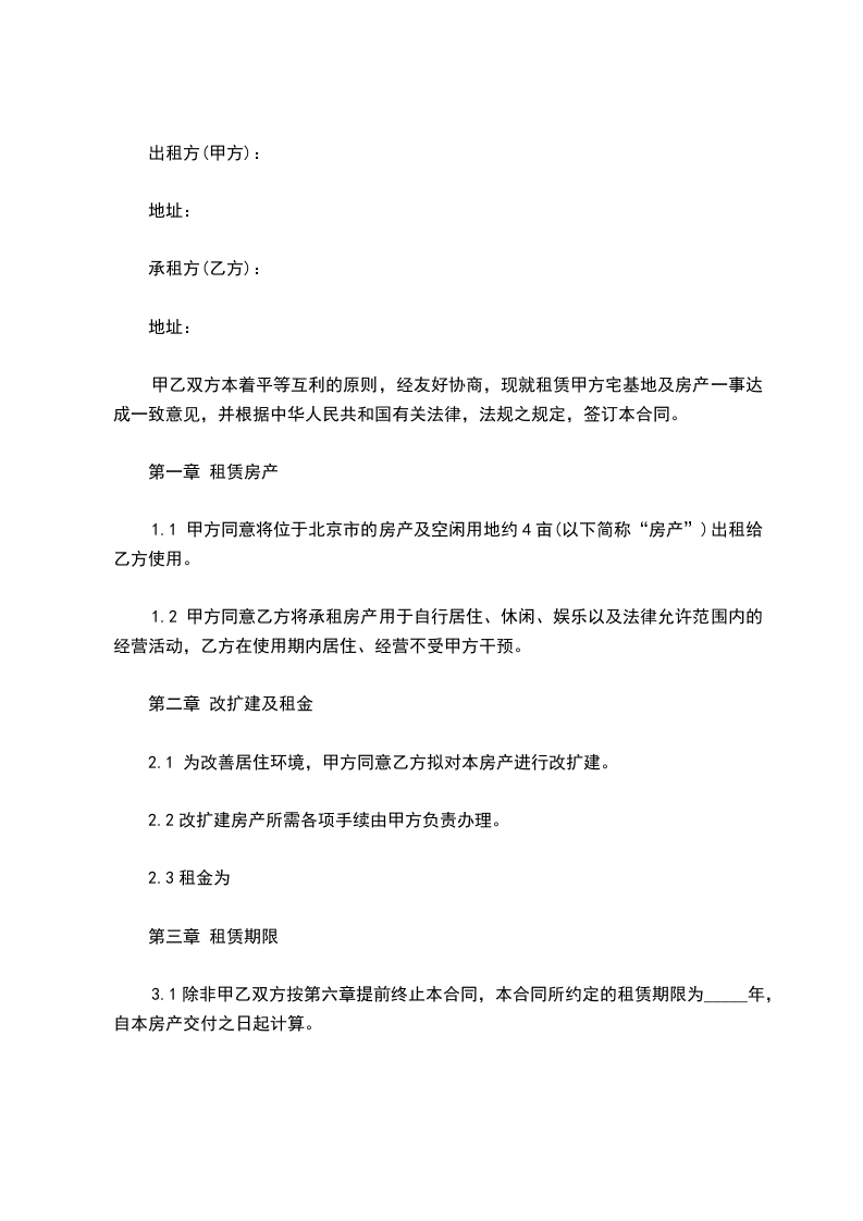 1、甲方同意将位于北京市的房产及空闲用地约4亩(以下简称“房产”)出租给乙方使用。