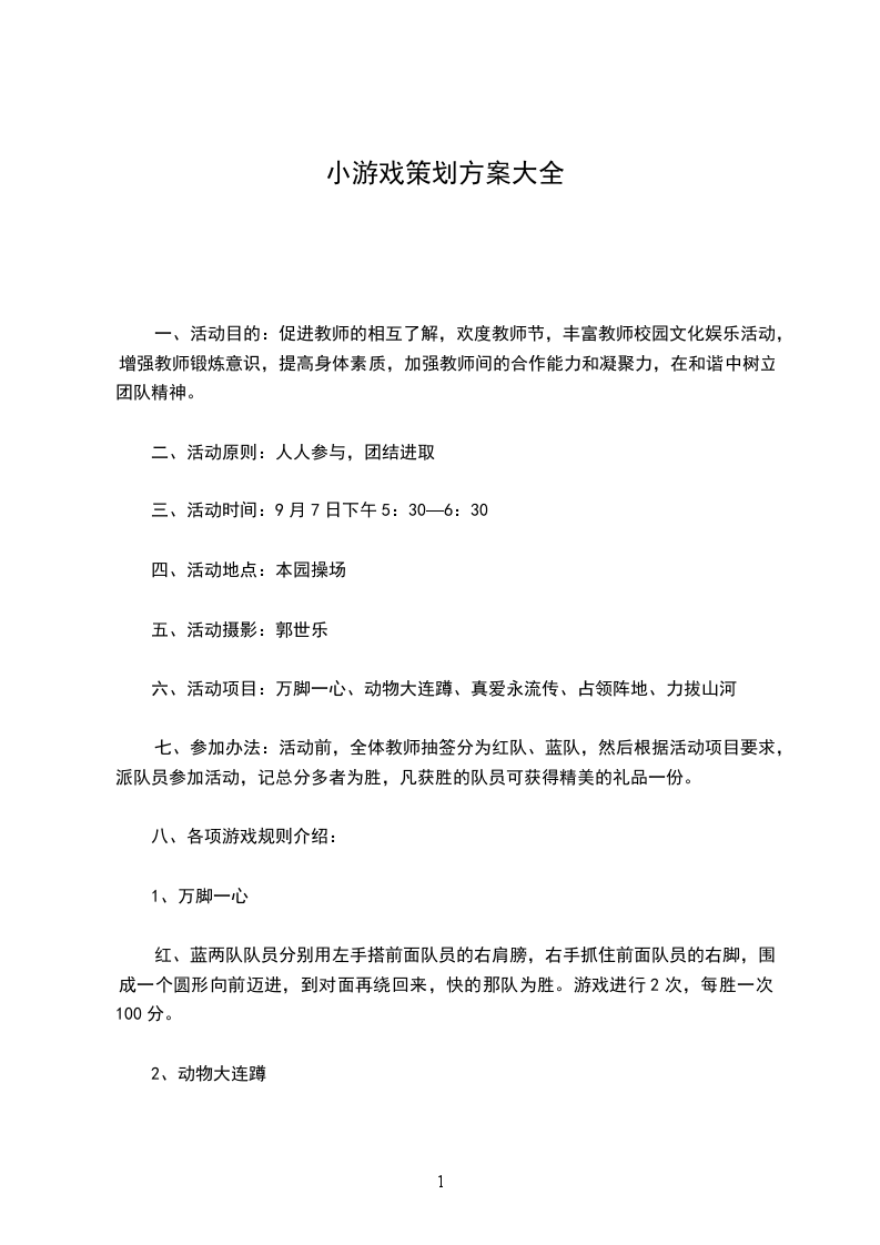 六、活动项目:万脚一心、动物大连蹲、真爱永流传、占领阵地、力拔山河
