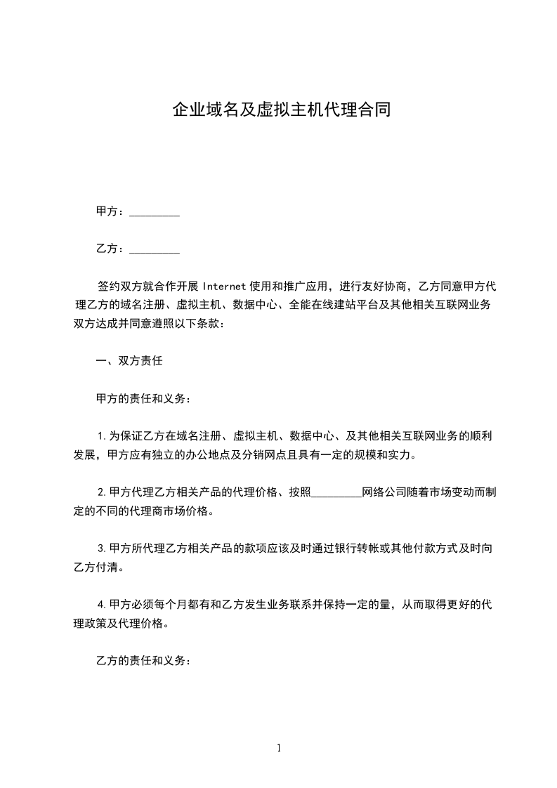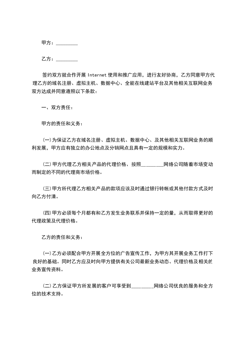 签约双方就合作开展Internet使用和推广应用,进行友好协商,乙方同意甲方代理乙方的域名注册、虚拟主机、数据中心、全能在线建站平台及其他相关互联网业务,双方达成并同意遵照以下条款: