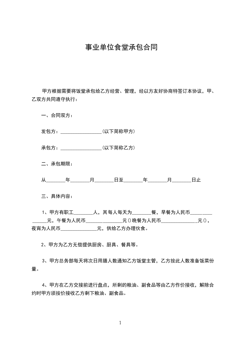 甲方根据需要将饭堂承包给乙方经营、管理,经以方友好协商特签订本协议,甲、乙双方共同遵守执行: