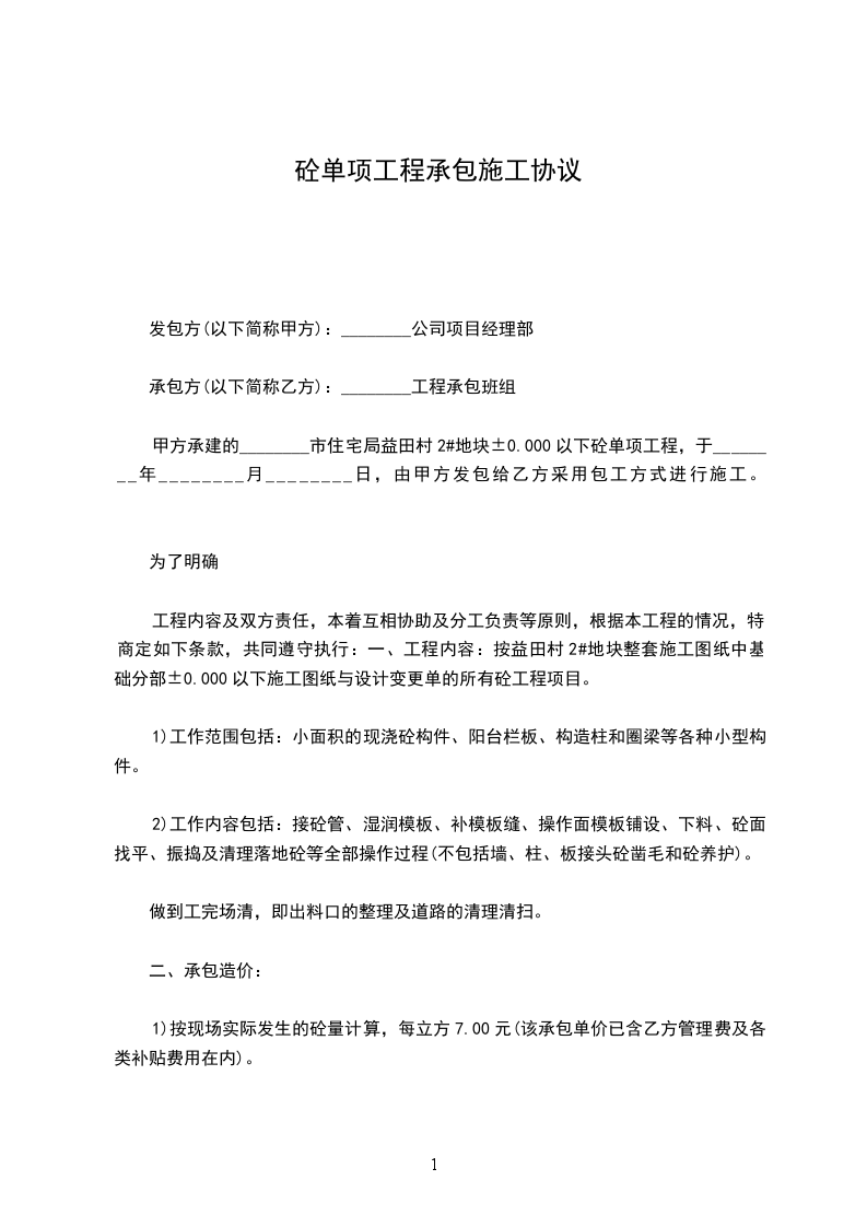 1)按现场实际发生的砼量计算,每立方7.00元(该承包单价已含乙方管理费及各类补贴费用在内)。现场计时工每工日为25.00元。