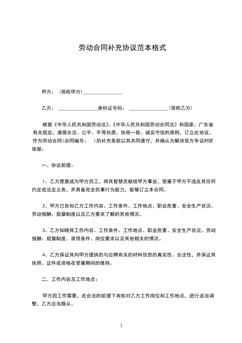 根据《中华人民共和国劳动法》、《中华人民共和国劳动合同法》和国家、广东省有关规定,遵循合法、公平、平等自愿、协商一致、诚实守信的原则,订立此协议,作为劳动合同(合同编号: )的补充条款以其共同遵守,并确认为解决双方争议时的依据: