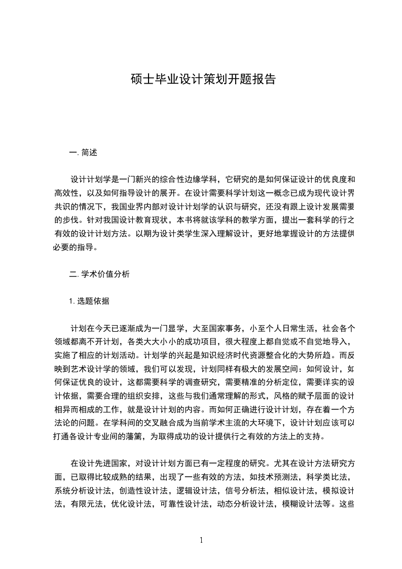 在设计先进国家,对设计计划方面已有一定程度的研究。尤其在设计方法研究方面,已取得比较成熟的结果,出现了一些有效的方法,如技术预测法,科学类比法,系统分析设计法,创造性设计法,逻辑设计法,信号分析法,相似设计法,模拟设计法,有限元法,优化设计法,可靠性设计法,动态分析设计法,模糊设计法等。这些方法侧重于不同的专业设计方向,而设计计划面临不同设计专业,更需要的是一种整合的灵活的解决问题的计划方法。这就需要我们针对计划自身的学科特点,从现有的成型的方法群中进行提炼,总结出一套适应现在情况的设计计划方法来。