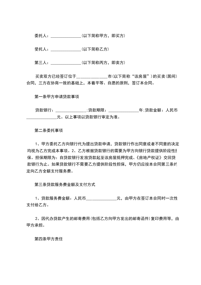 1、甲方委托乙方向银行代为提出贷款申请,贷款银行作出同意或者不同意的决定均视为乙方完成本事项。2、乙方根据贷款银行的需要为甲方向银行贷款提供阶段性担保。担保期限为:自贷款银行发放贷款起至该房屋抵押完成、《房地产权证》交回贷款银行为止。如果贷款银行不需要乙方提供阶段性担保,甲方仍应按本合同第三条约定向乙方全额支付服务费。