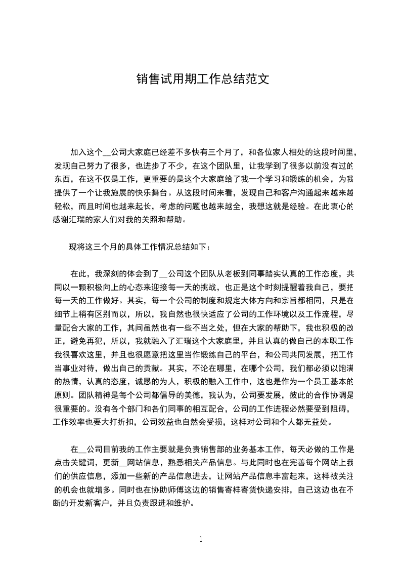 在此,我深刻的体会到了__公司这个团队从老板到同事踏实认真的工作态度,共同以一颗积极向上的心态来迎接每一天的挑战,也正是这个时刻提醒着我自己,要把每一天的工作做好。其实,每一个公司的制度和规定大体方向和宗旨都相同,只是在细节上稍有区别而以,所以,我自然也很快适应了公司的工作环境以及工作流程,尽量配合大家的工作,其间虽然也有一些不当之处,但在大家的帮助下,我也积极的改正,避免再犯,所以,我就融入了汇瑞这个大家庭里,并且认真的做自己的本职工作。我很喜欢这里,并且也很愿意把这里当作锻练自己的平台,和公司共同发展,把工作当事业对待,做出自己的贡献。其实,不论在哪里,在哪个公司,我们都必须以饱满的热情,认真的态度,诚恳的为人,积极的融入工作中,这也是作为一个员工基本的原则。团队精神是每个公司都倡导的美德,我认为,公司要发展,彼此的合作协调是很重要的。没有各个部门和各们同事的相互配合,公司的工作进程必然要受到阻碍,工作效率也要大打折扣,公司效益也自然会受损,这样对公司和个人都无益处。