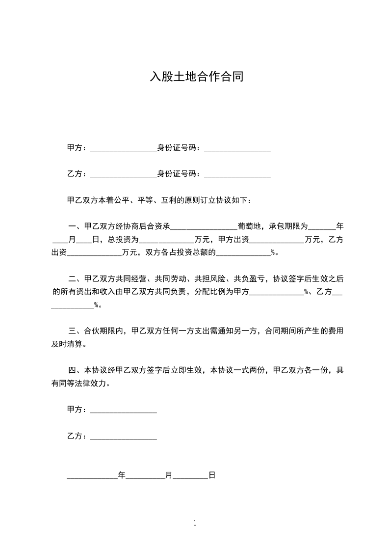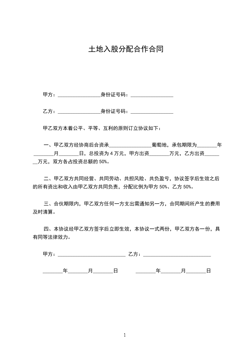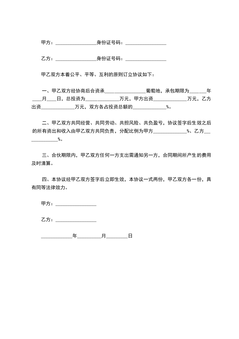 一、甲乙双方经协商后合资承_________________葡萄地,承包期限为_______年____月____日,总投资为______________万元,甲方出资______________万元,乙方出资______________万元,双方各占投资总额的______________%。