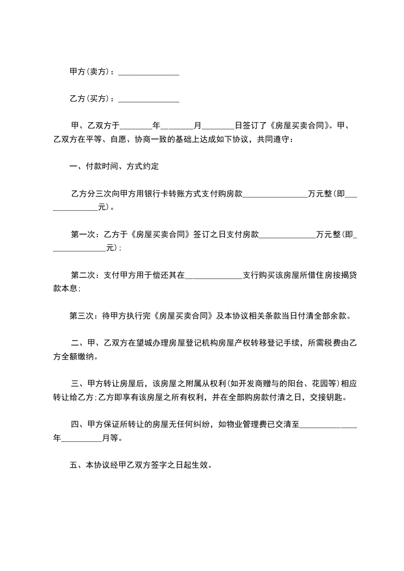 乙方分三次向甲方用银行卡转账方式支付购房款________________万元整(即______________元)。