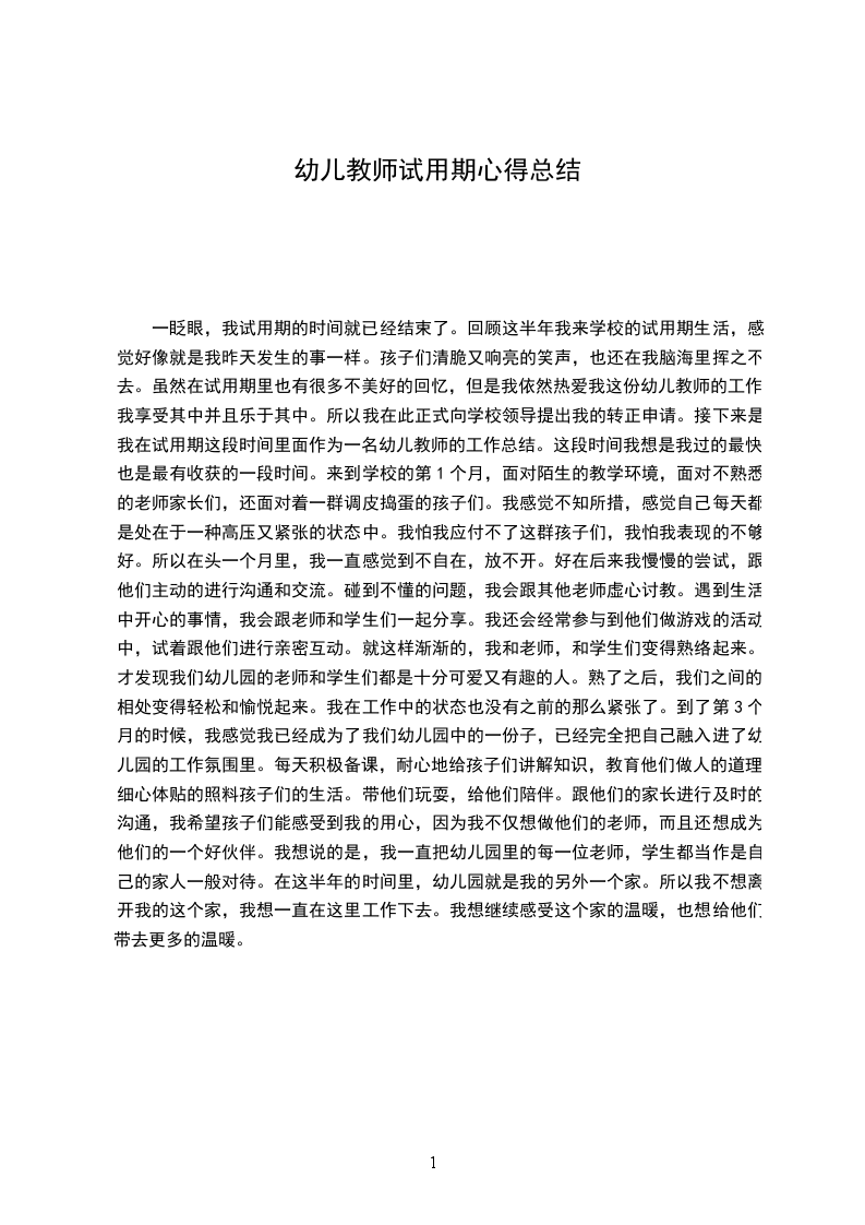 一眨眼,我试用期的时间就已经结束了。回顾这半年我来学校的试用期生活,感觉好像就是我昨天发生的事一样。孩子们清脆又响亮的笑声,也还在我脑海里挥之不去。虽然在试用期里也有很多不美好的回忆,但是我依然热爱我这份幼儿教师的工作。我享受其中并且乐于其中。所以我在此正式向学校领导提出我的转正申请。接下来是我在试用期这段时间里面作为一名幼儿教师的工作总结。