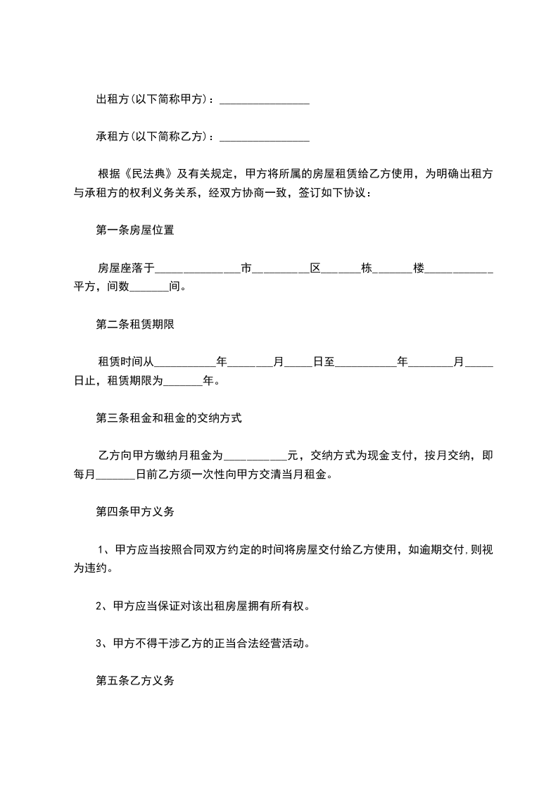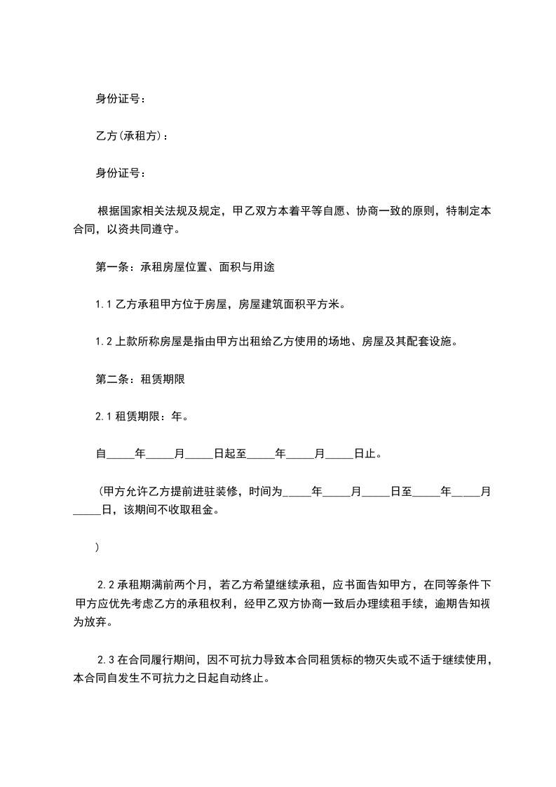 2、若承租方在出租方没有违反本合同的情况下提前解除合同,视为承租方违约,承租方负责赔偿违约金_________元。