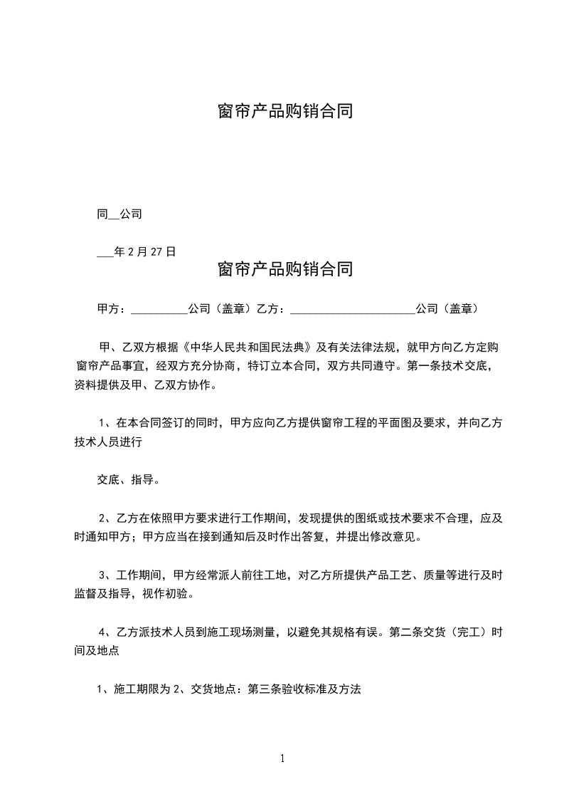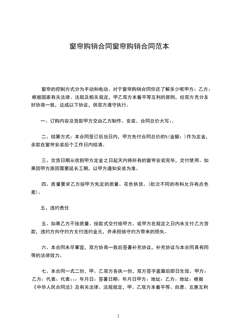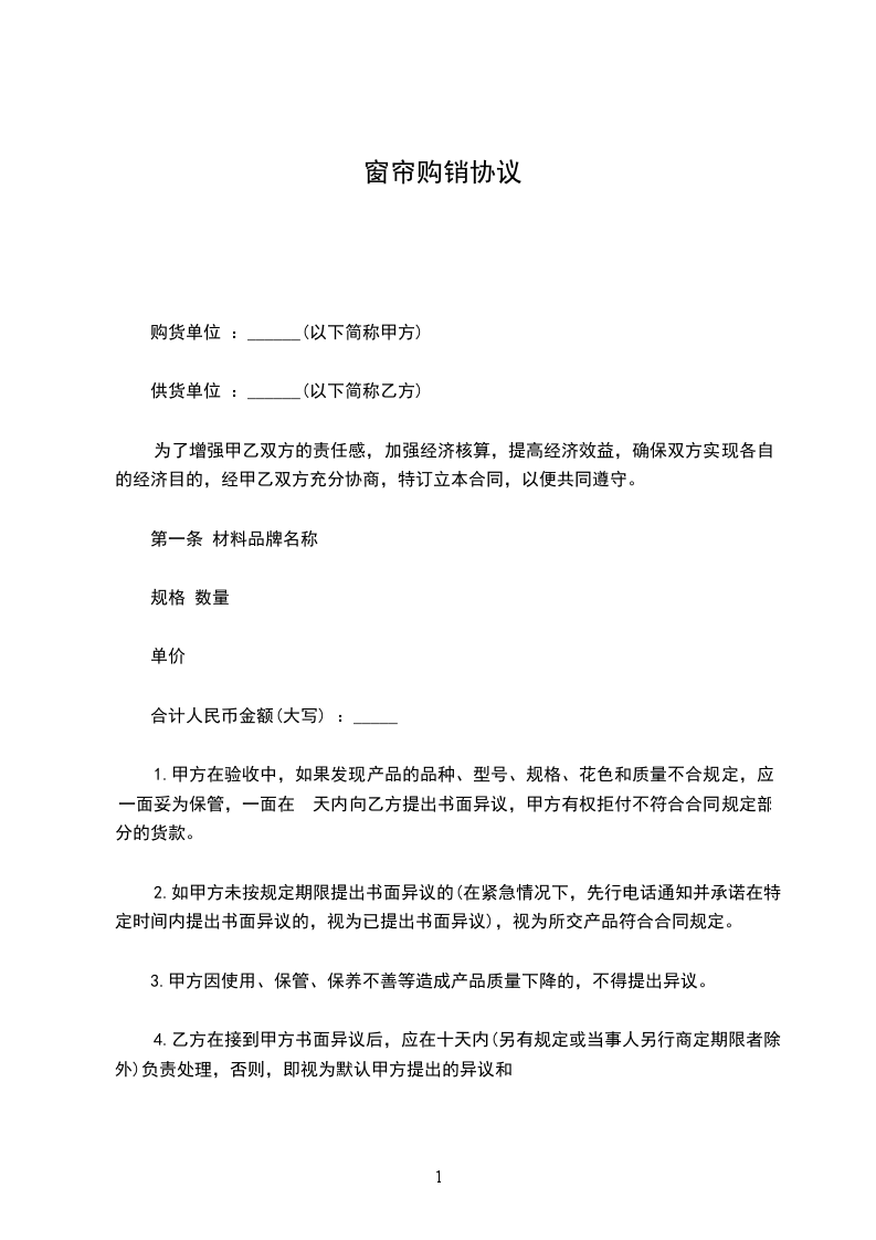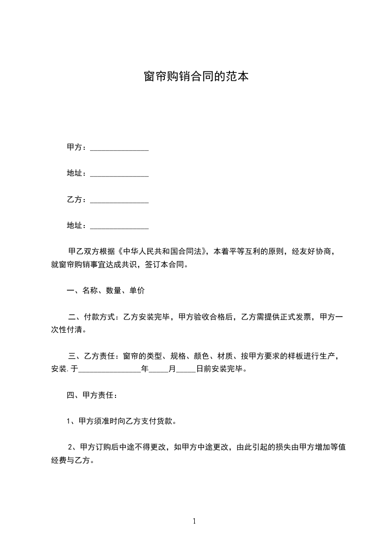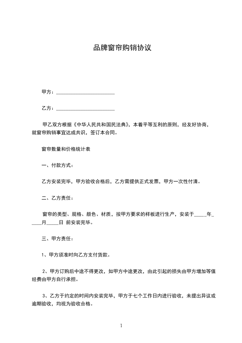 甲乙双方根据《中华人民共和国民法典》,本着平等互利的原则,经友好协商,就窗帘购销事宜达成共识,签订本合同。