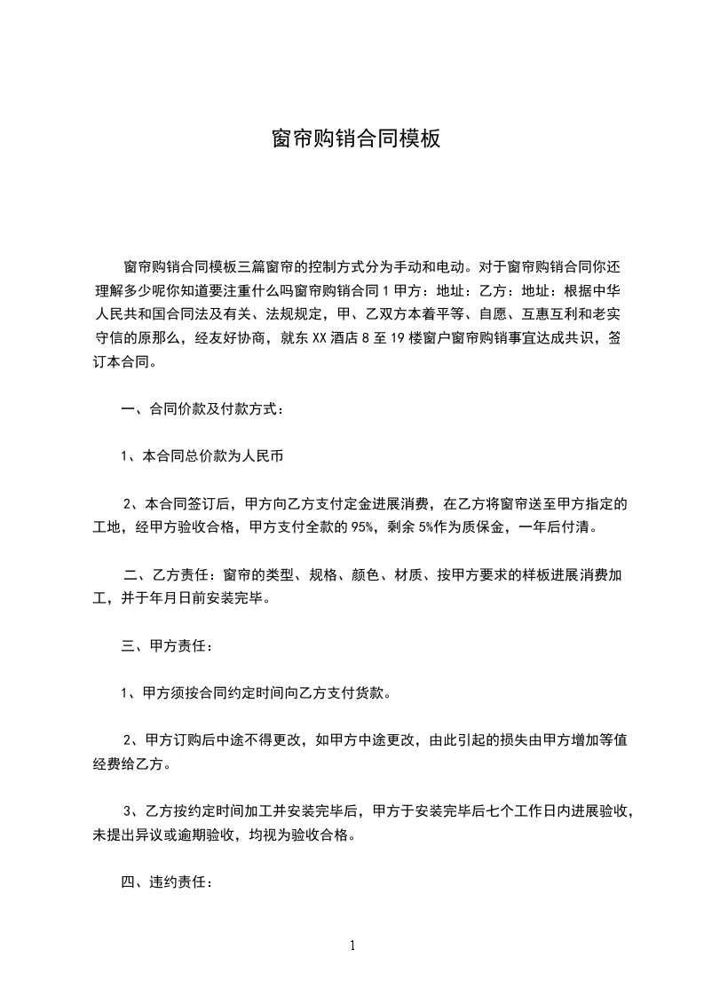 三、乙方责任:窗帘的类型、规格、颜色、材质、按甲方要求的样板进行生产,安装.于________________年_____月_____日前安装完毕。