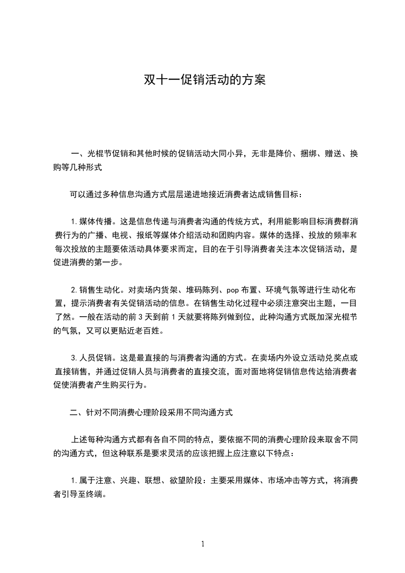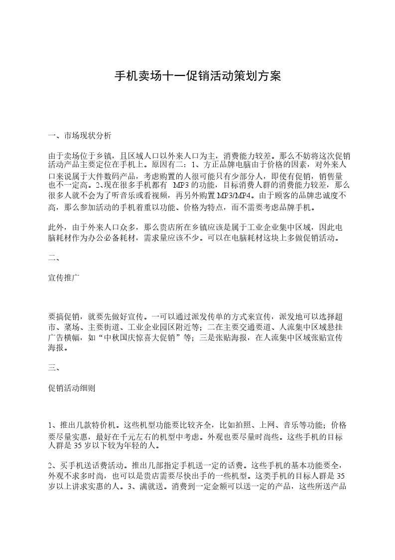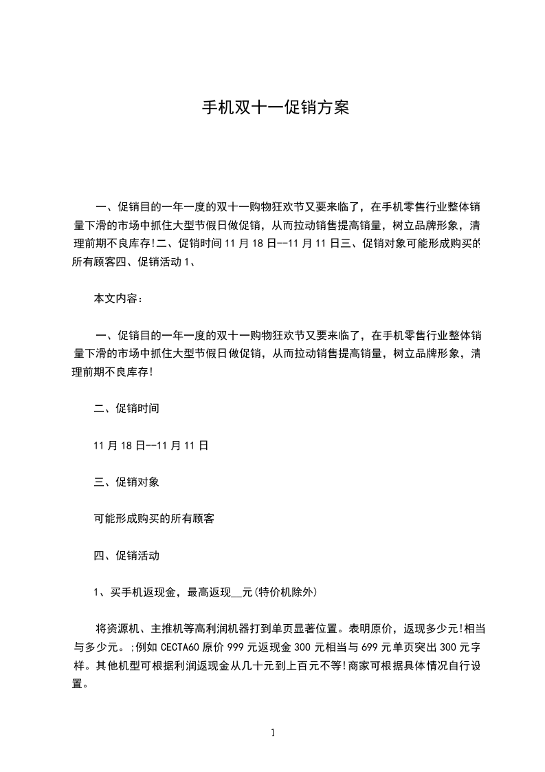 一、促销目的一年一度的双十一购物狂欢节又要来临了,在手机零售行业整体销量下滑的市场中抓住大型节假日做促销,从而拉动销售提高销量,树立品牌形象,清理前期不良库存!二、促销时间11月18日--11月11日三、促销对象可能形成购买的所有顾客四、促销活动1、