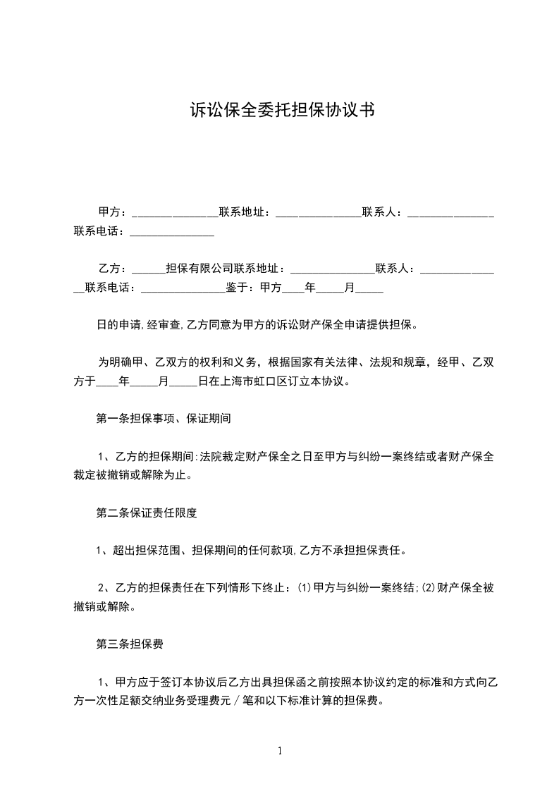 鉴于:甲方 ____ 年 _____ 月 _____ 日的申请,经审查,乙方同意为甲方的诉讼财产保全申请提供担保。为明确甲、乙双方的权利和义务,根据国家有关法律、法规和规章,经甲、乙双方于____ 年 _____ 月 _____ 日在上海市虹口区订立本协议。