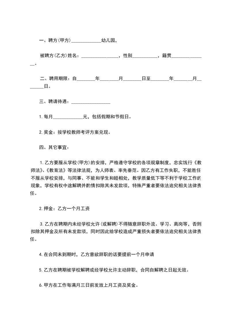 一、聘方(甲方)_____________幼儿园,
