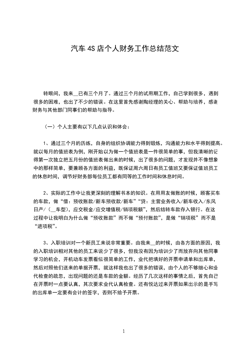 4、做财务方面的工作本身就有很大的风险。那是我第一次参加周末值班,第一次值班我就出了错误,顾客的维修保养费是785元,顾客是刷卡消费的,我当时不知为何帮顾客刷了455元,事后发现少收了330元,由是第一次接触到这样的情况,也不知道该怎么处理。当时心里就比较的乱,幸好晓春和我一起值班,她让我给顾客打电话。顾客是一位通情达理的人,款项我是顺利的追回了。我当时给陶经理打电话的时候生怕他责备我,相反他并没有责怪我,而是对我说了一些鼓励的话,经历了这件事帮助我对风险意识的形成和提高。做财务一定要细心、谨慎。