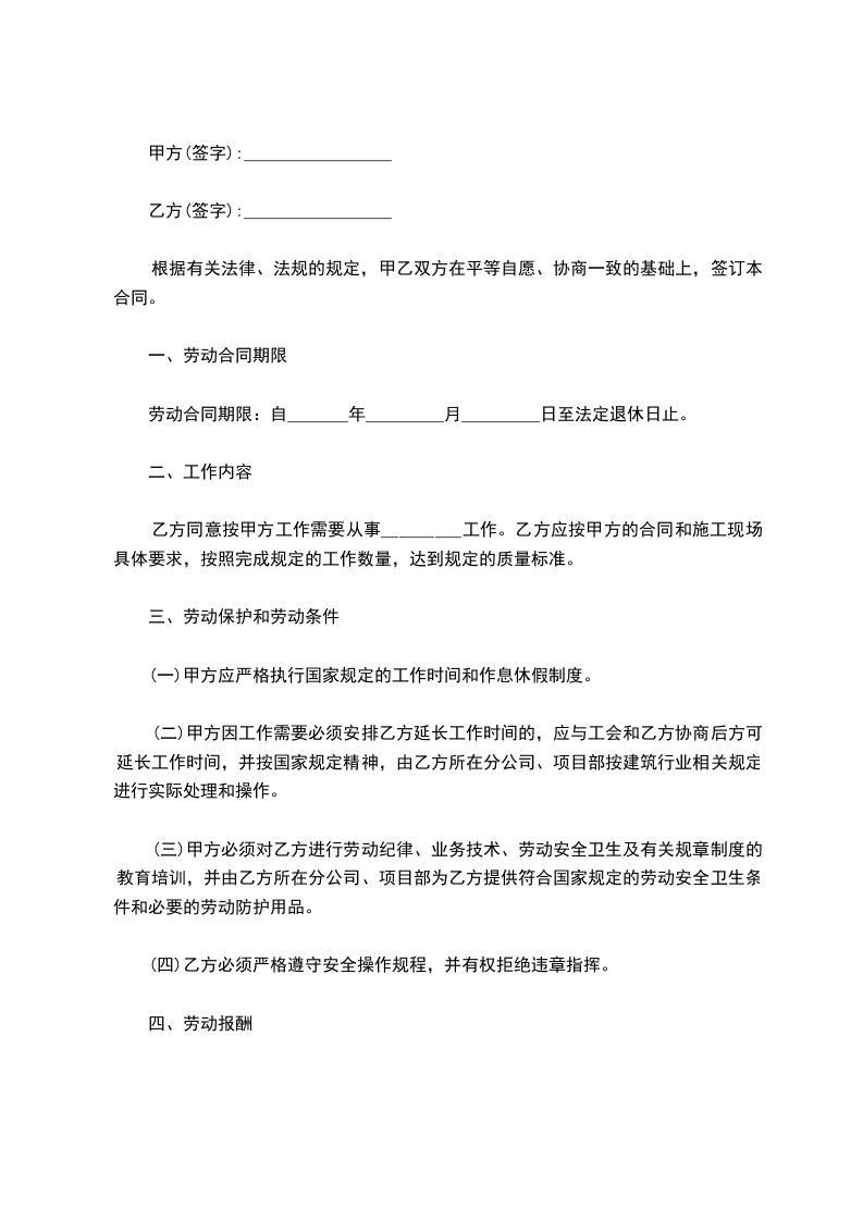 (一)甲方根据国家有关规定和企业经营状况,并根据乙方岗位、职务和其他条件确定其相应的工资标准,由乙方所在分公司、项目部按建筑行业相关规定,依法、足额、按约发放到位。