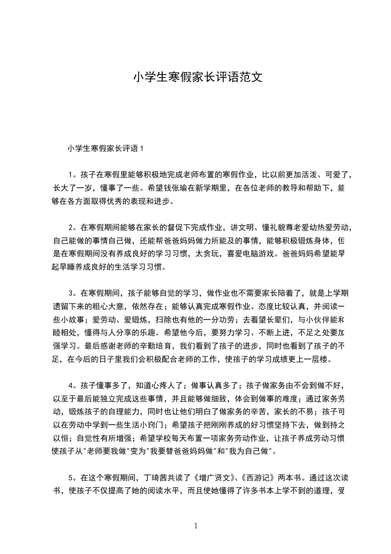 3。在寒假期间,孩子能够自觉的学习,做作业也不需要家长陪着了,就是上学期遗留下来的粗心大意,依然存在;能够认真完成寒假作业、态度比较认真,并阅读一些小故事;爱劳动、爱锻炼,扫除也有他的一分功劳;去看望长辈们,与小伙伴能和睦相处,懂得与人分享的乐趣。希望他今后,要努力学习、不断上进,不足之处要加强学习。最后感谢老师的辛勤培育,我们看到了孩子的进步,同时也看到了孩子的不足,在今后的日子里我们会积极配合老师的工作,使孩子的学习成绩更上一层楼。