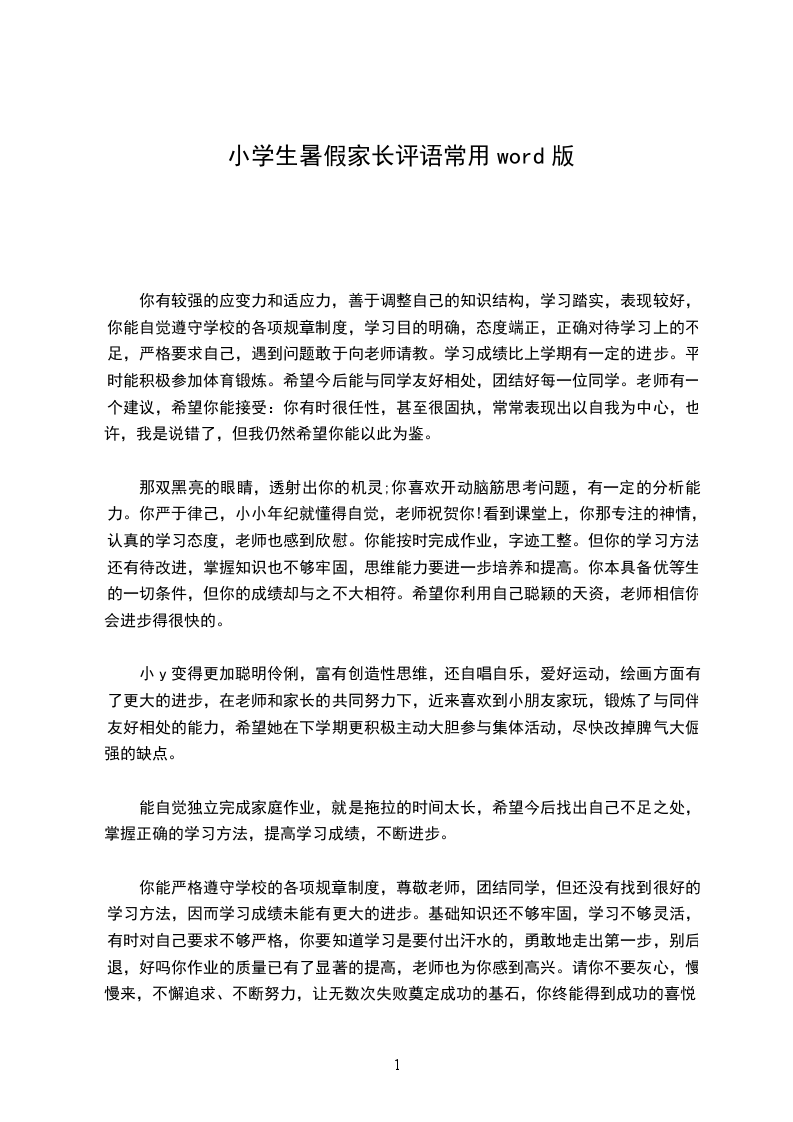 1。孩子在寒假里能够积极地完成老师布置的寒假作业,比以前更加活泼、可爱了,长大了一岁,懂事了一些。希望钱张瑜在新学期里,在各位老师的教导和帮助下,能够在各方面取得优秀的表现和进步。