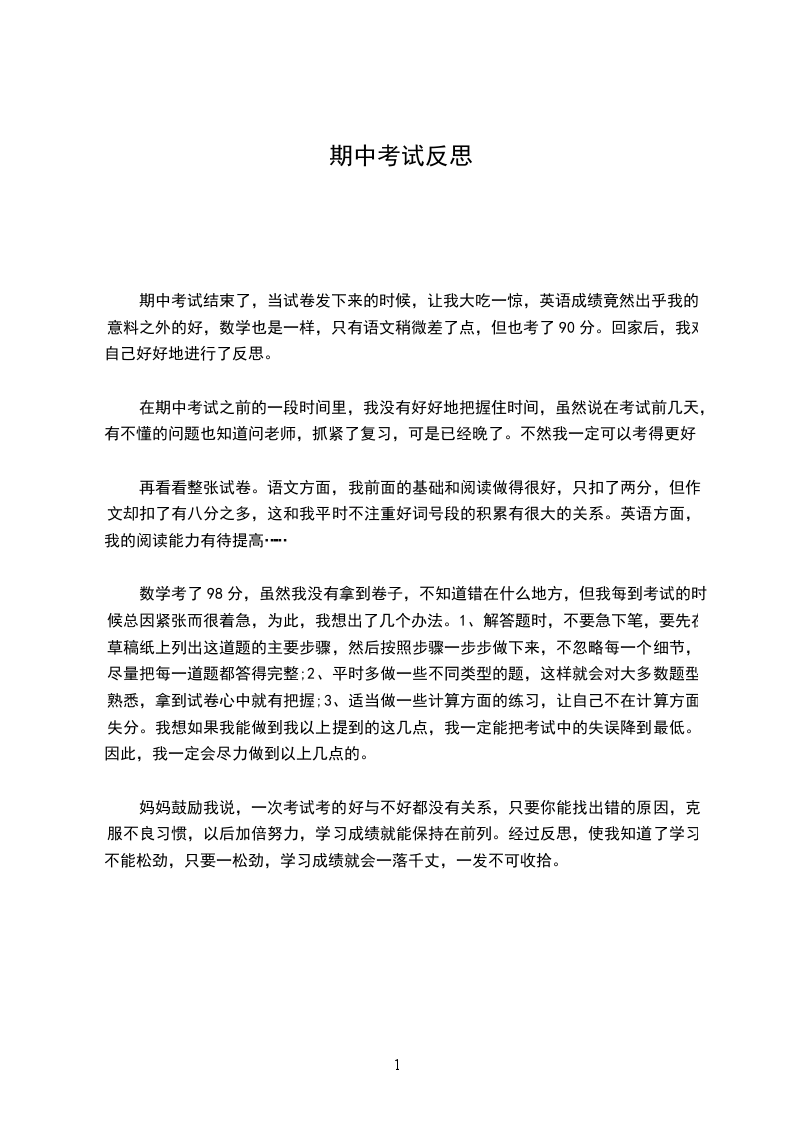 妈妈鼓励我说,一次考试考的好与不好都没有关系,只要你能找出错的原因,克服不良习惯,以后加倍努力,学习成绩就能保持在前列。经过反思,使我知道了学习不能松劲,只要一松劲,学习成绩就会一落千丈,一发不可收拾。