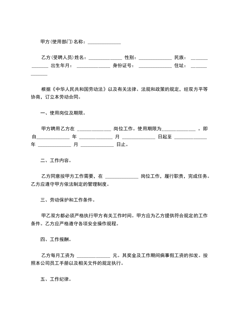 甲方聘用乙方在 ______________ 岗位工作。使用期限为______________ 。即自______________ 年 ______________ 月 ______________ 日起至 ______________ 年 ______________ 月 ______________ 日止。