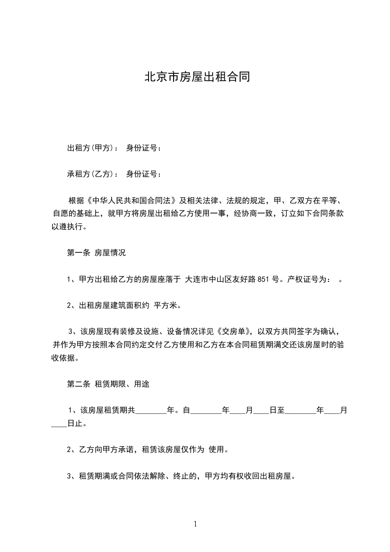 1、甲方出租给乙方的房屋座落于 大连市中山区友好路851号。产权证号为: 。