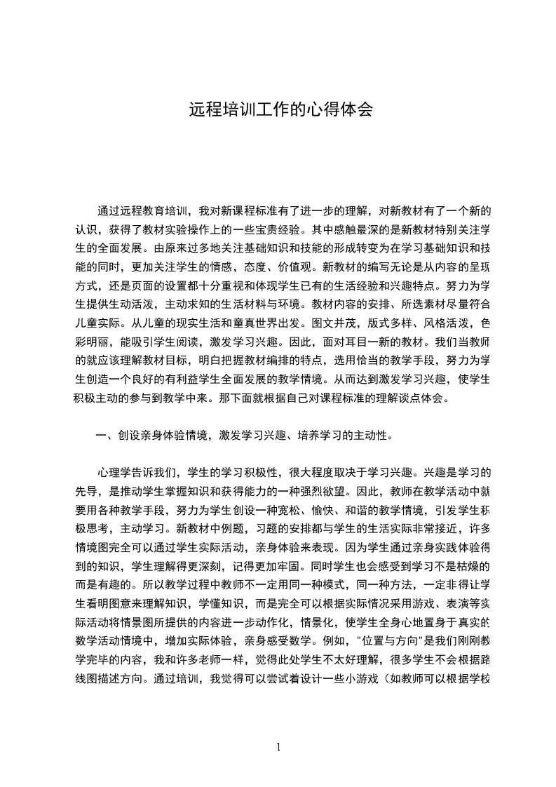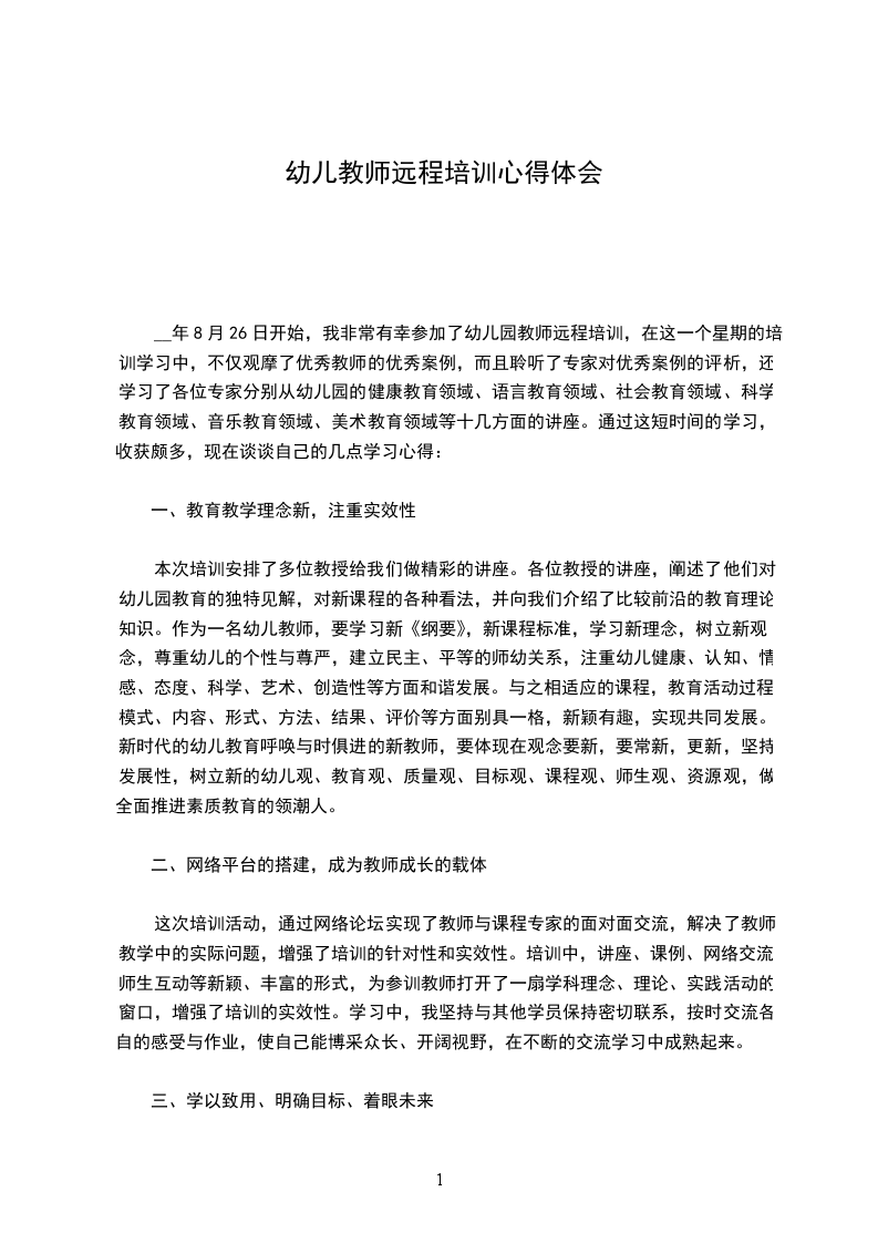 __年8月26日开始,我非常有幸参加了幼儿园教师远程培训,在这一个星期的培训学习中,不仅观摩了优秀教师的优秀案例,而且聆听了专家对优秀案例的评析,还学习了各位专家分别从幼儿园的健康教育领域、语言教育领域、社会教育领域、科学教育领域、音乐教育领域、美术教育领域等十几方面的讲座。通过这短时间的学习,收获颇多,现在谈谈自己的几点学习心得:
