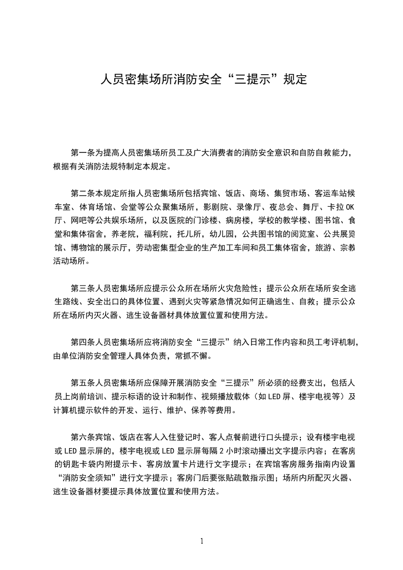 第五条人员密集场所应保障开展消防安全“三提示”所必须的经费支出,包括人员上岗前培训、提示标语的设计和制作、视频播放载体(如LED屏、楼宇电视等)及计算机提示软件的开发、运行、维护、保养等费用。
