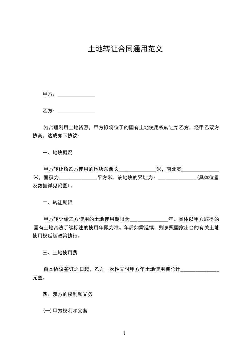 甲方转让给乙方使用的土地使用期限为_______________年。具体以甲方取得的国有土地合法手续标注的使用年限为准。年后如需延续,则参照国家出台的有关土地使用权延续政策执行。