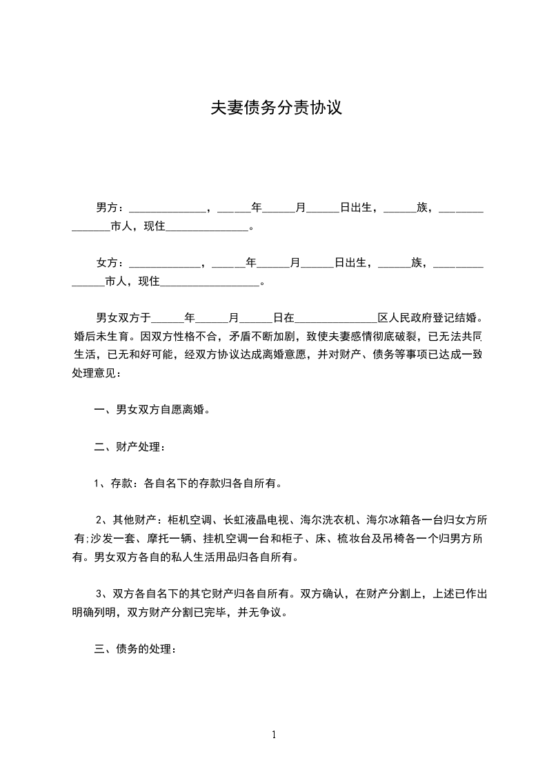 男女双方于______年______月______日在_______________区人民政府登记结婚。婚后未生育。因双方性格不合,矛盾不断加剧,致使夫妻感情彻底破裂,已无法共同生活,已无和好可能,经双方协议达成离婚意愿,并对财产、债务等事项已达成一致处理意见: