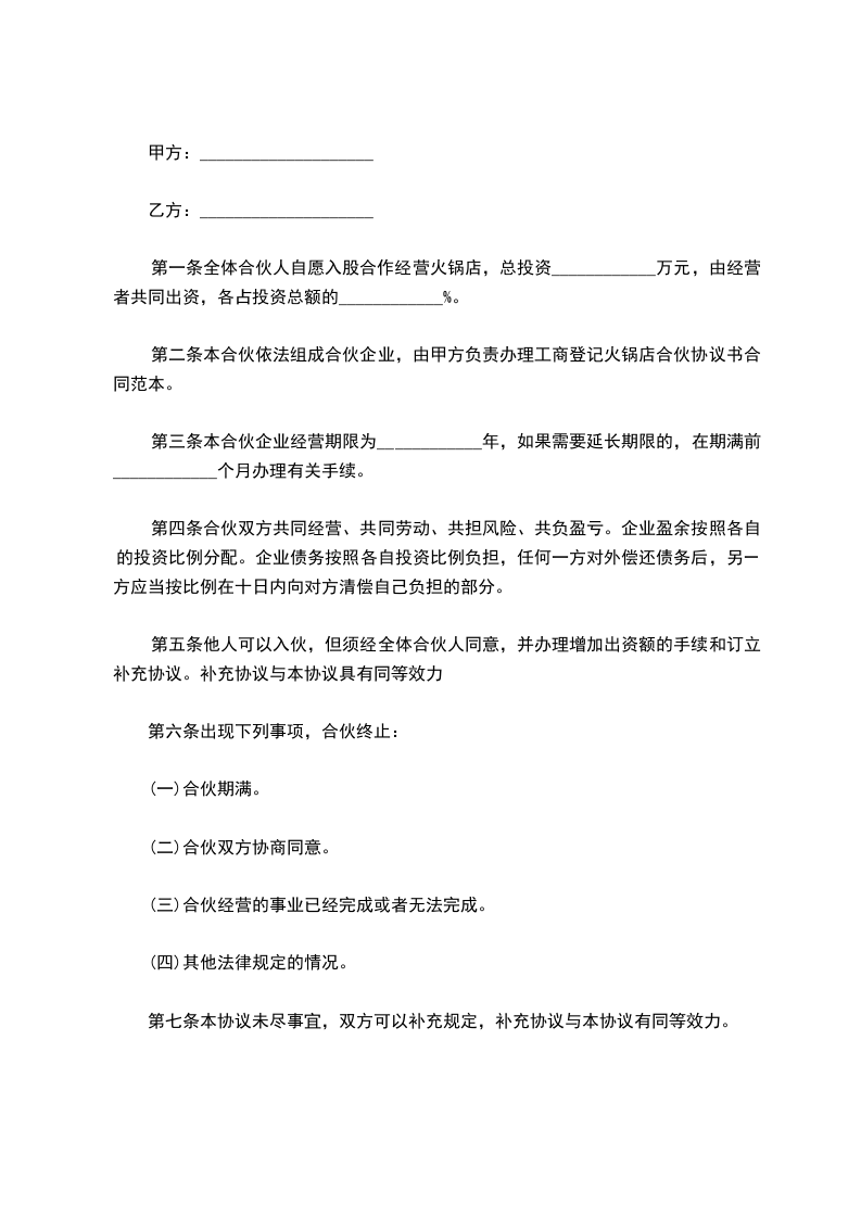 第二条本合伙依法组成合伙企业,由甲方负责办理工商登记火锅店合伙协议书合同范本。