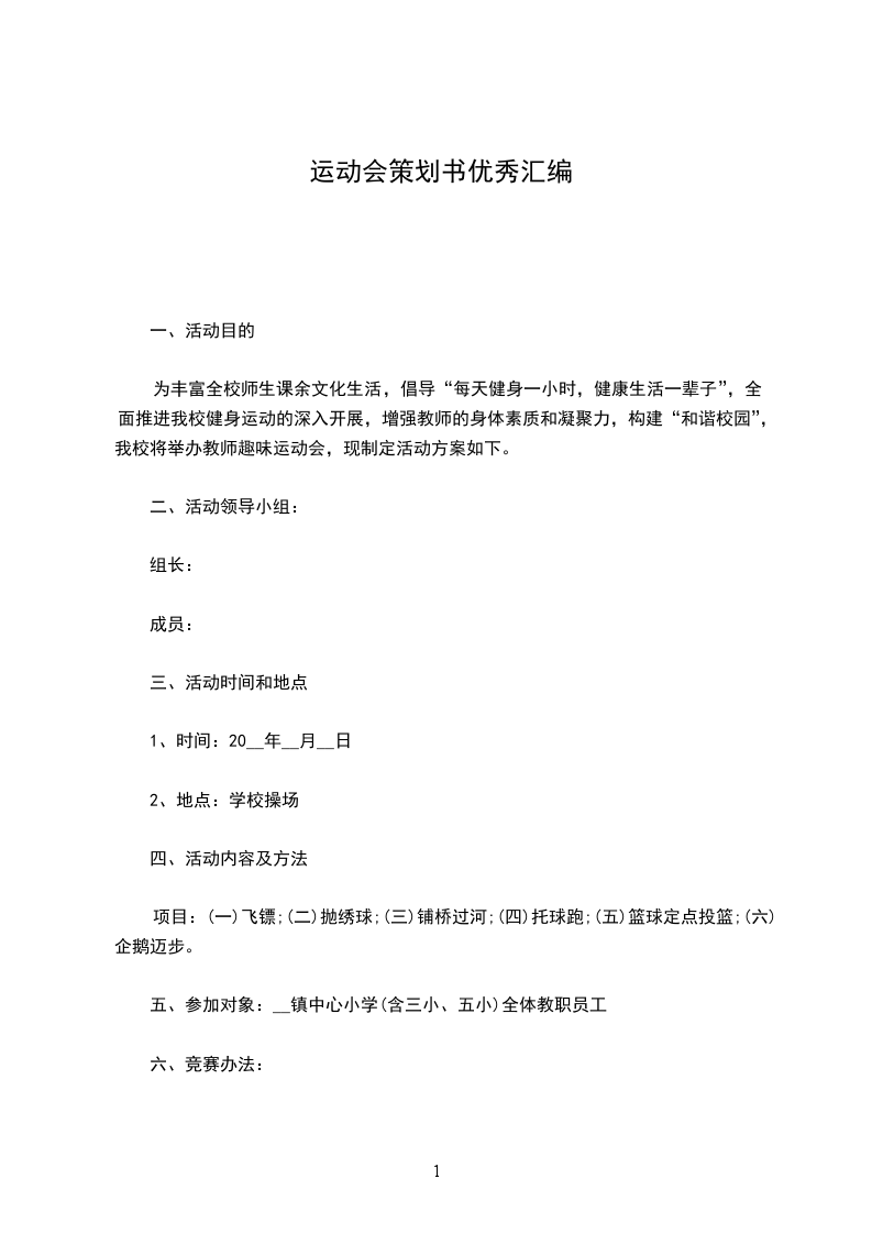 项目:(一)飞镖;(二)抛绣球;(三)铺桥过河;(四)托球跑;(五)篮球定点投篮;(六)企鹅迈步。