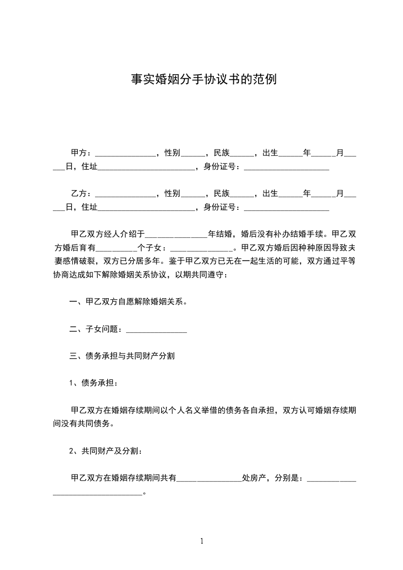 甲乙双方经人介绍于_______________年结婚,婚后没有补办结婚手续。甲乙双方婚后育有__________个子女:_______________。甲乙双方婚后因种种原因导致夫妻感情破裂,双方已分居多年。鉴于甲乙双方已无在一起生活的可能,双方通过平等协商达成如下解除婚姻关系协议,以期共同遵守: