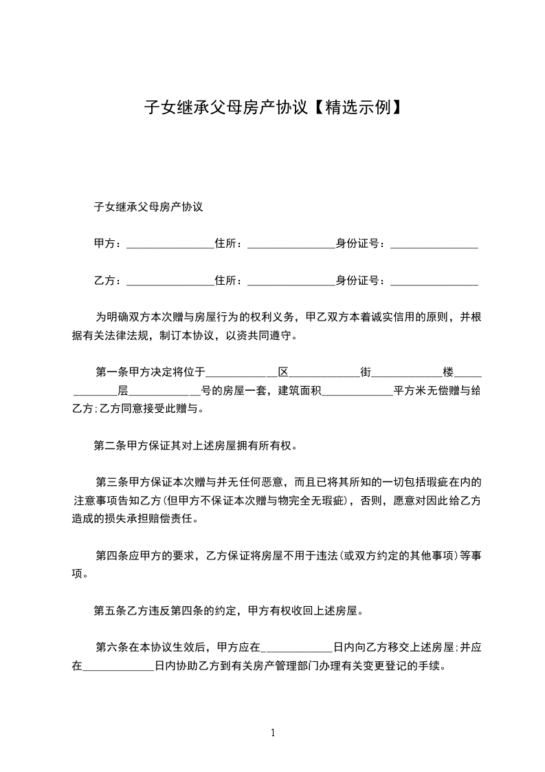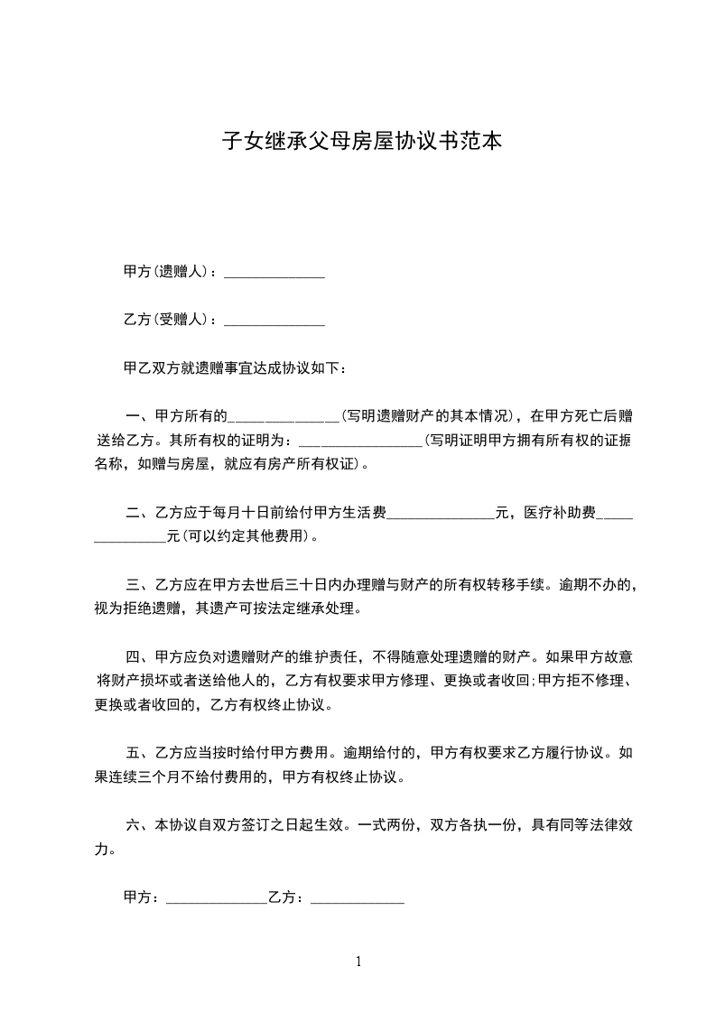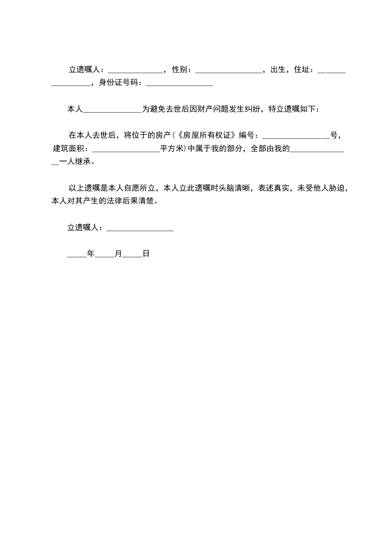 在本人去世后,将位于的房产(《房屋所有权证》编号:_________________号,建筑面积:_________________平方米)中属于我的部分,全部由我的________________一人继承。