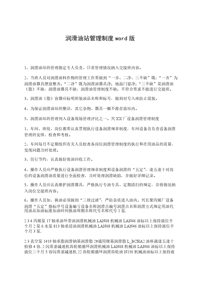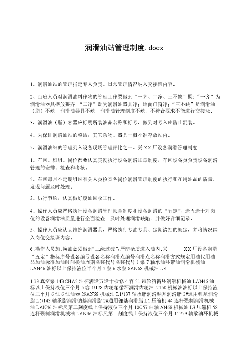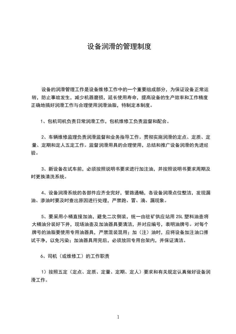 3.2.2、认真做好给设备加润滑,加(油、水)的五定(定人加油,定时化验或换油,定点供油,定质选油,定量用油)及液体润滑三过滤(进油时过滤、放油时过滤、加油时过滤)一沉淀工作。